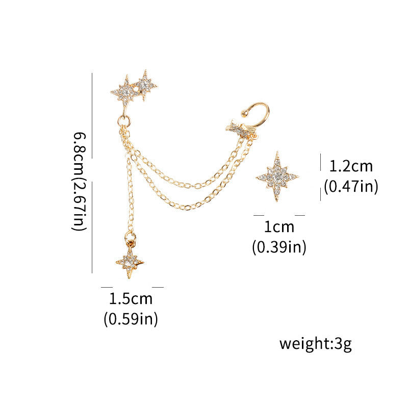 Accesorios para las orejas divinos, en donde un arete incluye una cadena que se cuelga en otra parte de la oreja mientras que en la otra oreja solo iría el arete individual.