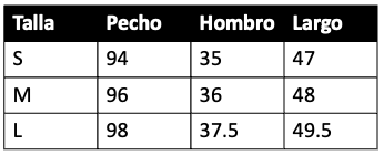 *Recomendamos revisar la tabla de medidas antes de realizar la compra. Si tienes dudas entre dos medidas, te recomendamos elegir la más grande.