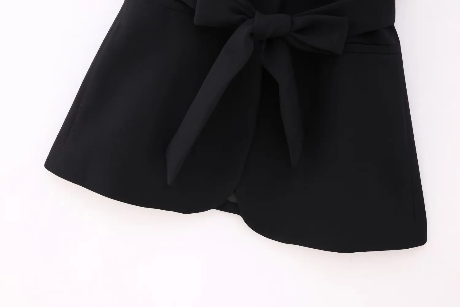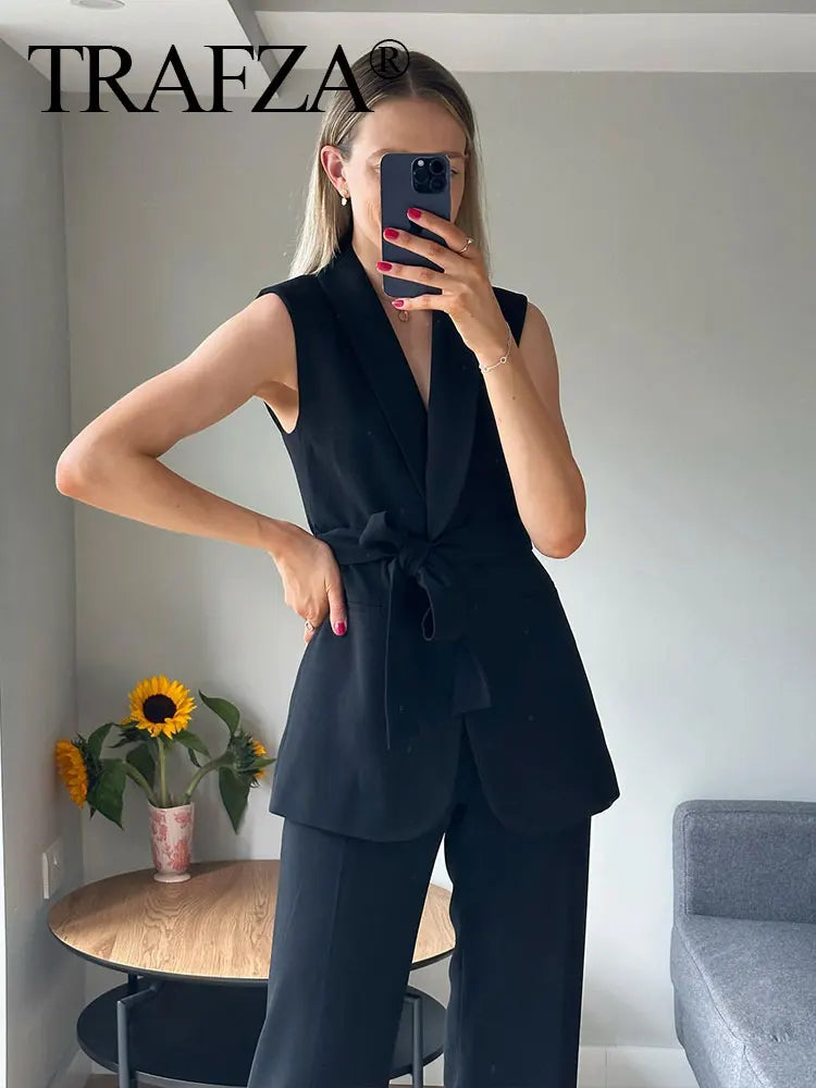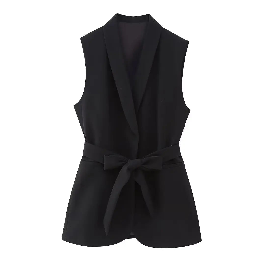 Chaleco largo, sin mangas, con cuello V y con un cinto en la cintura para entallar el cuerpo. Esta prenda es ideal para utilizarlo en eventos formales o casuales, dependiendo de con qué se combine, como un pantalón formal, unos jeans o una falda.