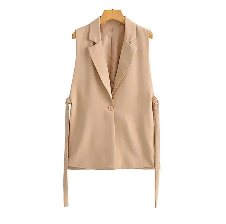 El chaleco es sin mangas, holgado y con un listón que puedes llevar colgando o puedes amarrar para hacer un poco de figura. Tiene un solo botón enfrente en el centro. El chaleco tiene forro por dentro.