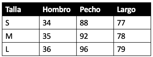 *Recomendamos revisar la tabla de medidas antes de realizar la compra. Si tienes dudas entre dos medidas, te recomendamos elegir la más grande.