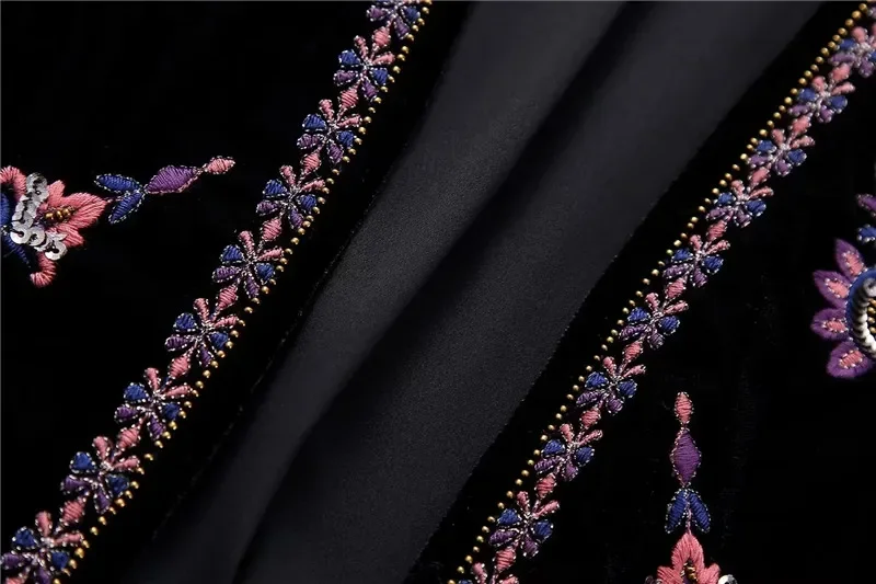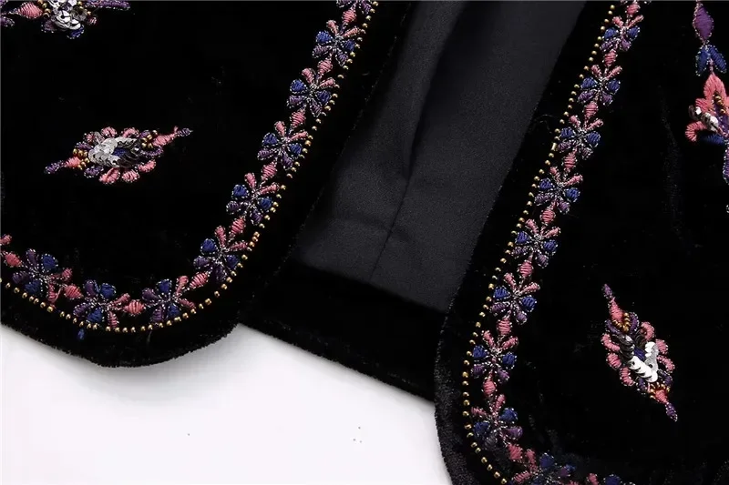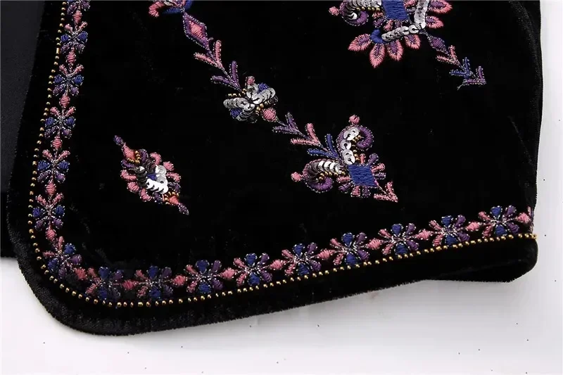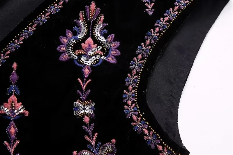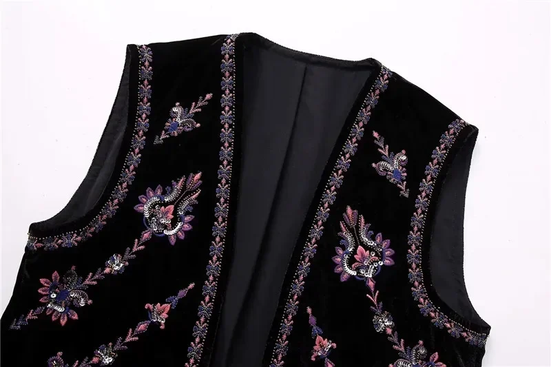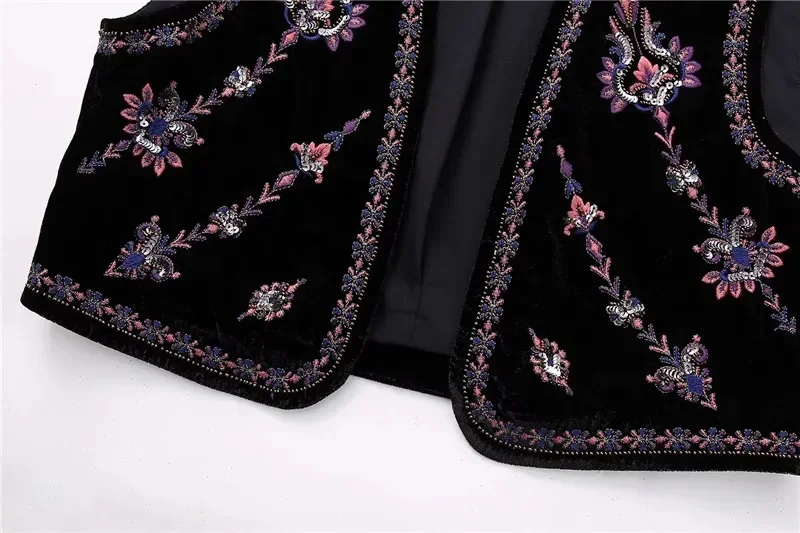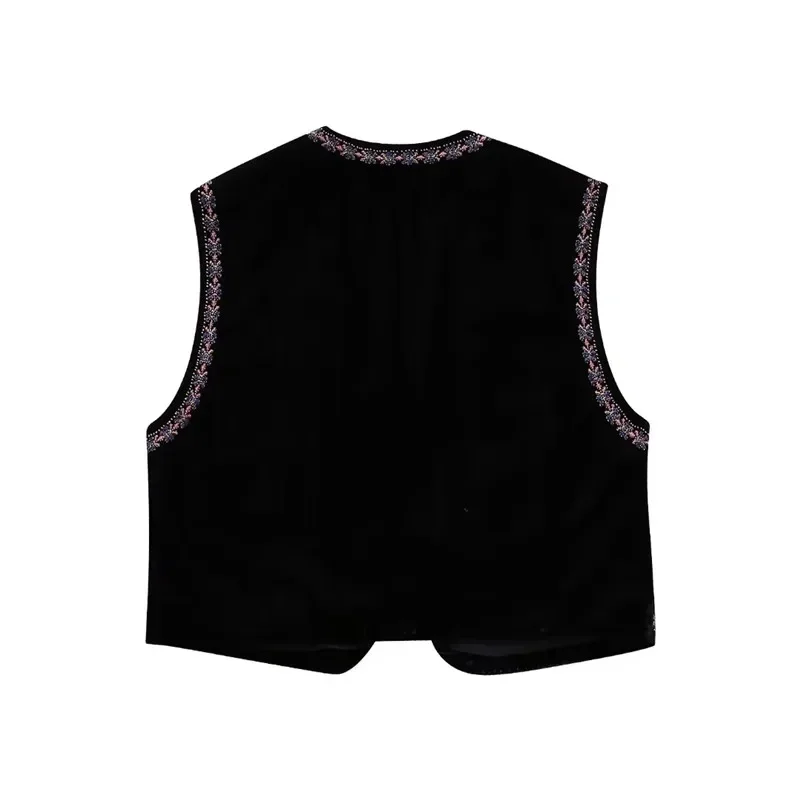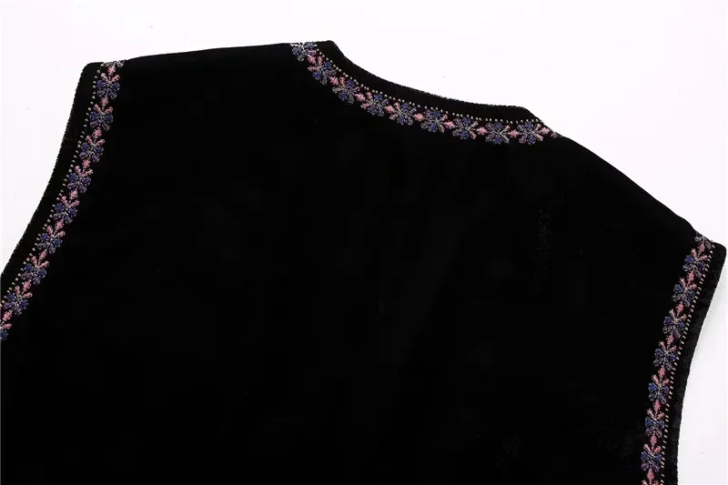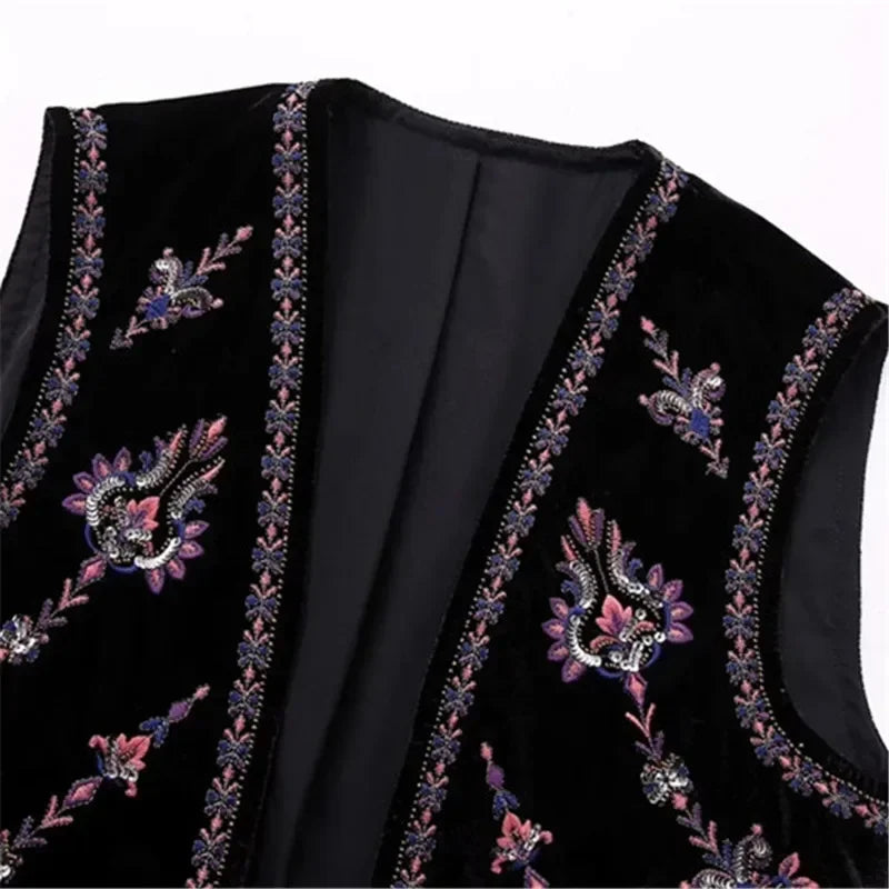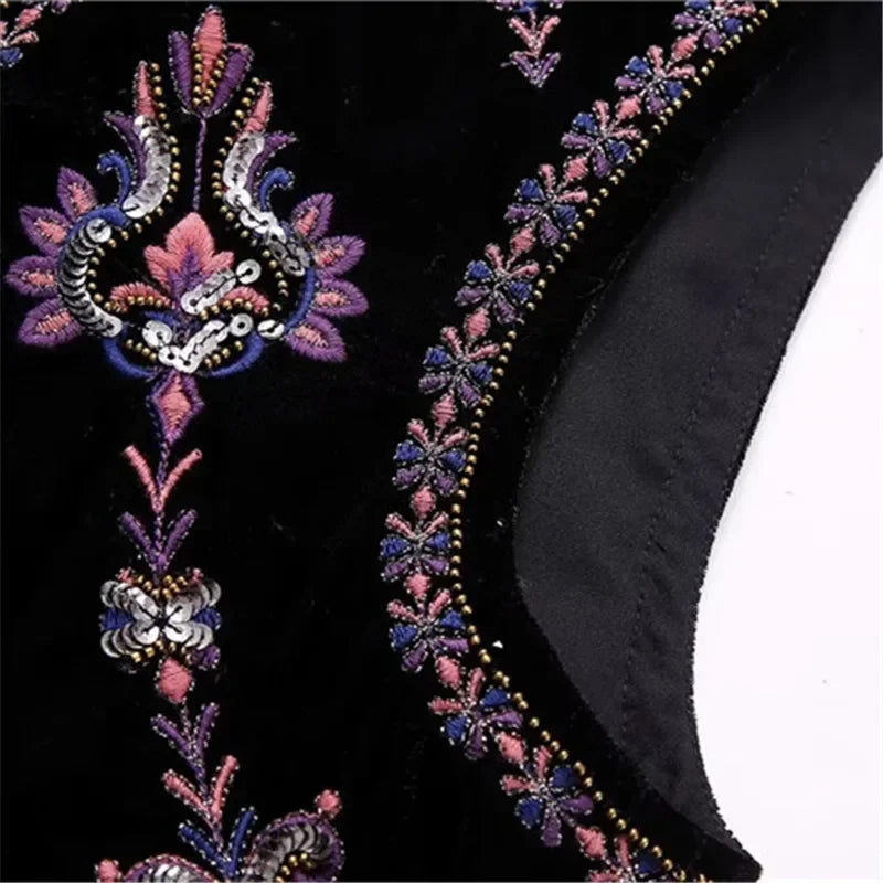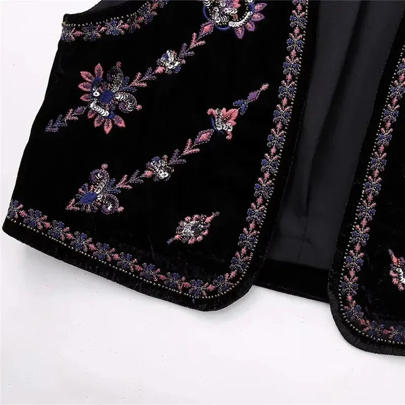 Chaleco de terciopelo con bordado y sin mangas. Ideal para usarlo arriba de una camisa de botones o una top lindo de mangas.