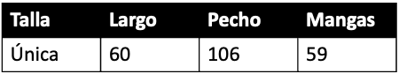 *Recomendamos revisar la tabla de medidas antes de realizar la compra. Si tienes dudas entre dos medidas, te recomendamos elegir la más grande.