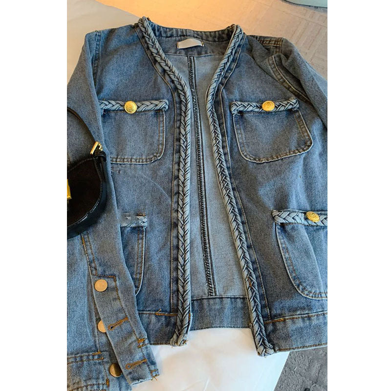 Una chamarra necesaria en tu vestidor. Es un clásico en tus outfits para este otoño e invierno. Una chamarra de mezclilla pero con toques diferenciales como trenzas que delinean el centro de la chamarra y la parte de arriba de los bolsillos. Esta chamarra se usa abierta, no se puede cerrar.