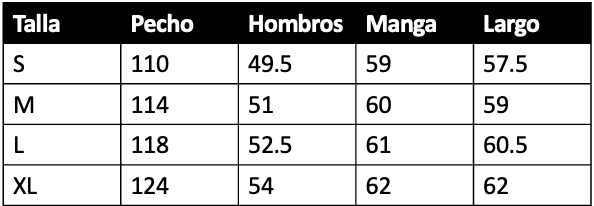 *Recomendamos revisar la tabla de medidas antes de realizar la compra. Si tienes dudas entre dos medidas, te recomendamos elegir la más grande.