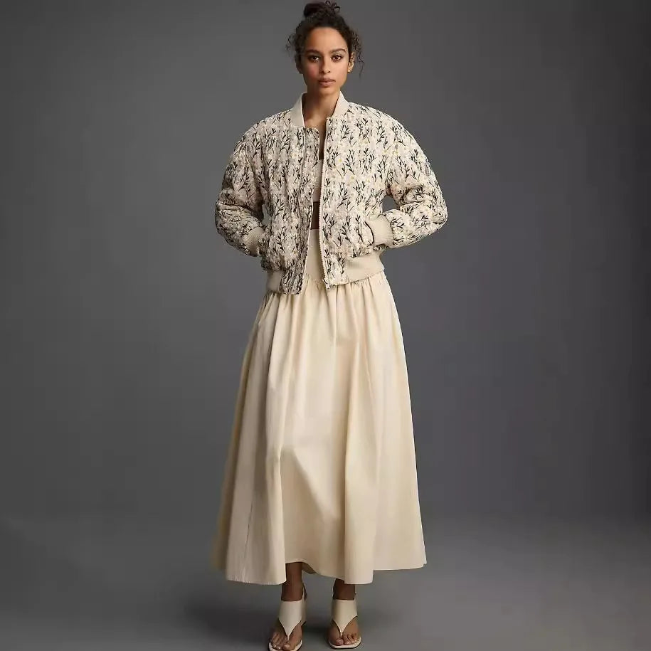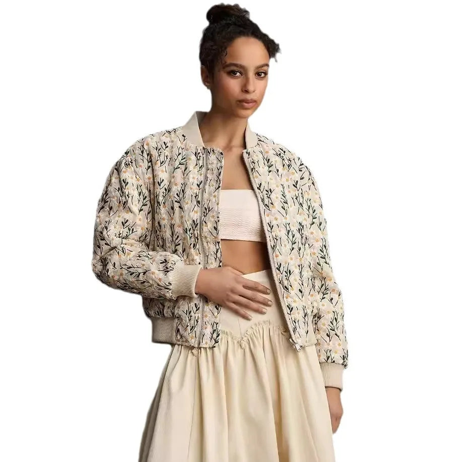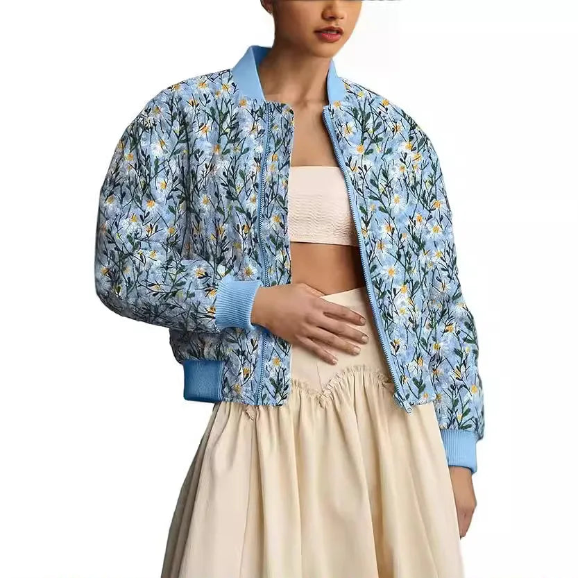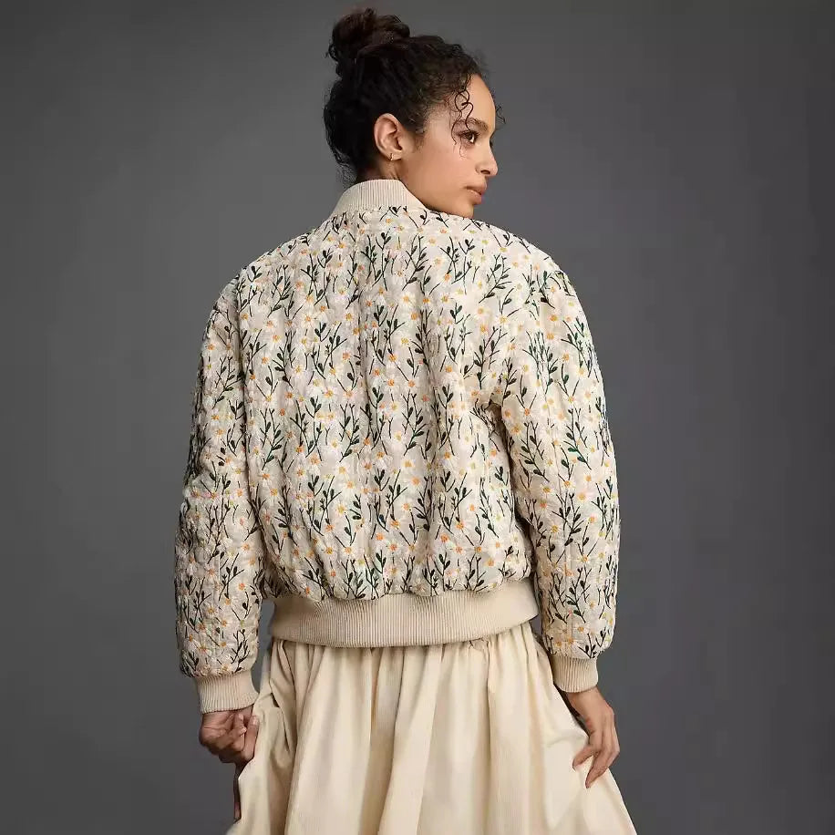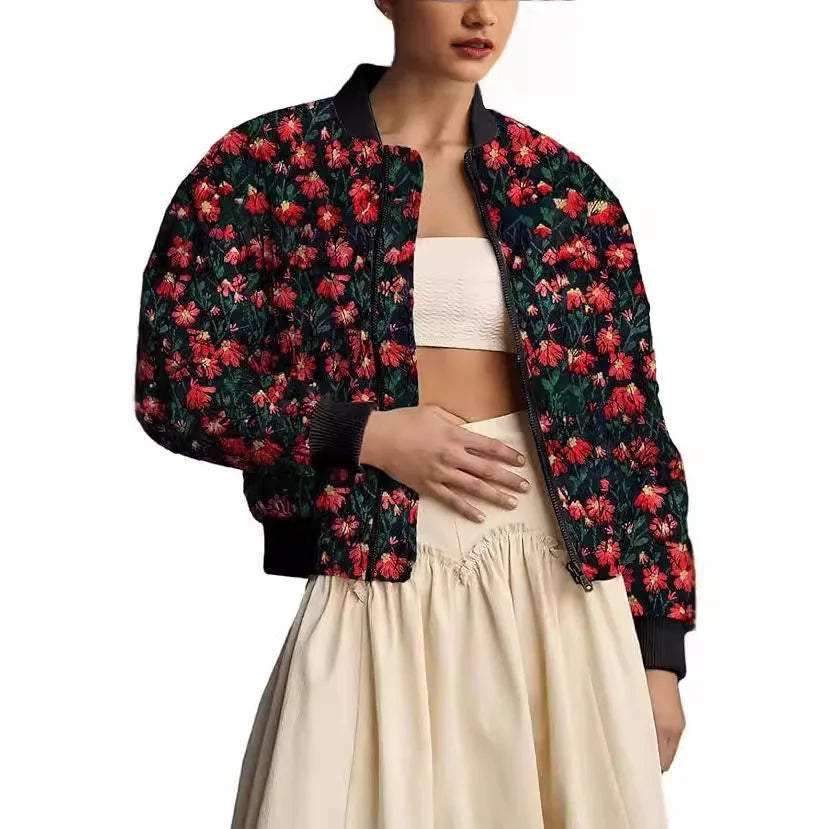Es una chamarrita con flores, se abrocha por un zipper por el centro, tiene dos bolsas en los lados y tiene un delineado de tela en el cuello, las mangas y la cintura del color que predomina en la prenda.