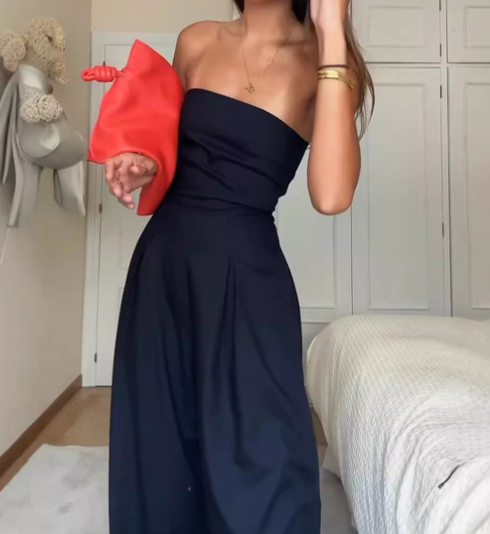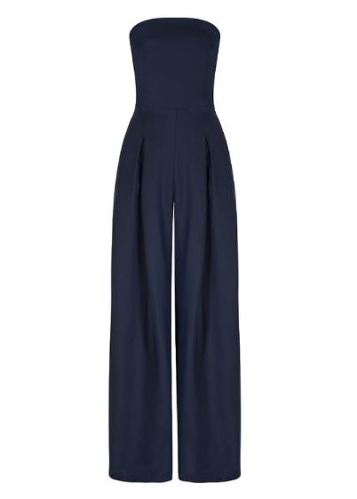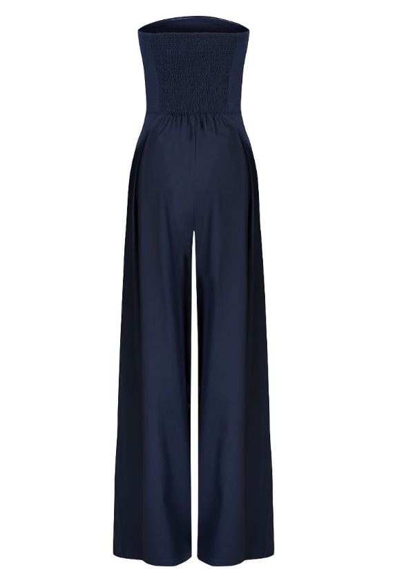 Un jumper muy lindo, en tendencia y cómodo. Es strapless, ajustado del torso, tiene tela elástica en la parte de atrás para ayudar a ajustarlo a tu cuerpo y a partir de la cintura se abre para que los pantalones caigan como palazzos.