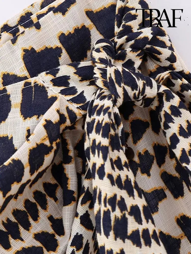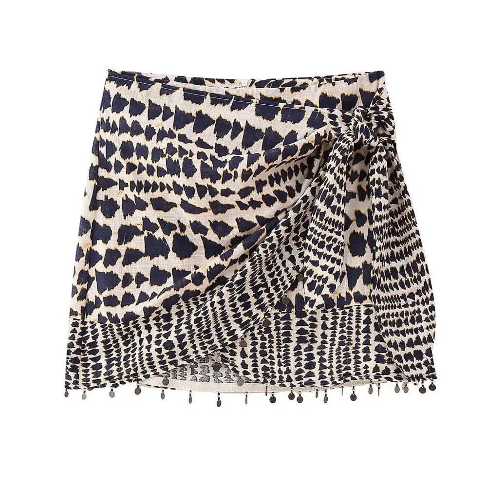 Mini falda de cintura alta, con un diseño de un nudo de un lado, del estilo de la línea TRAF que vende una marca muy conocida.