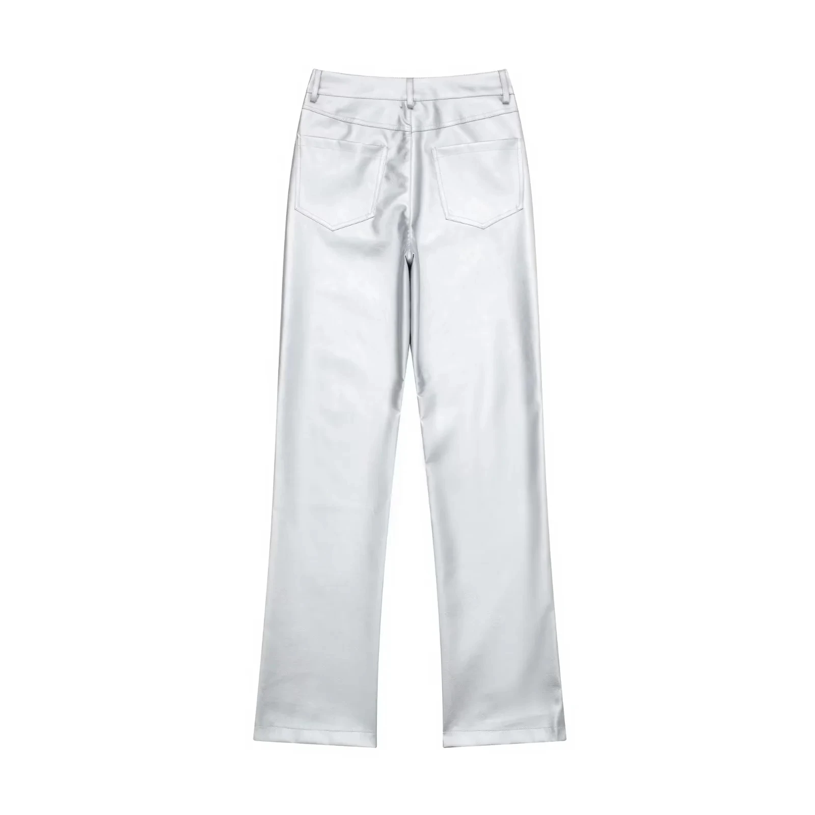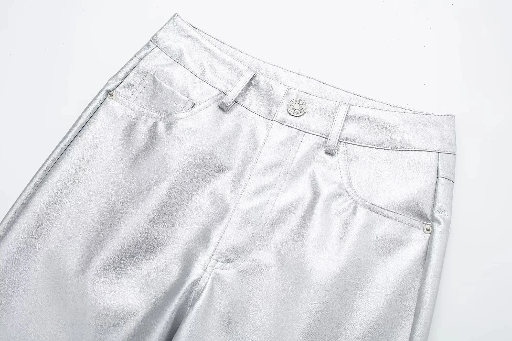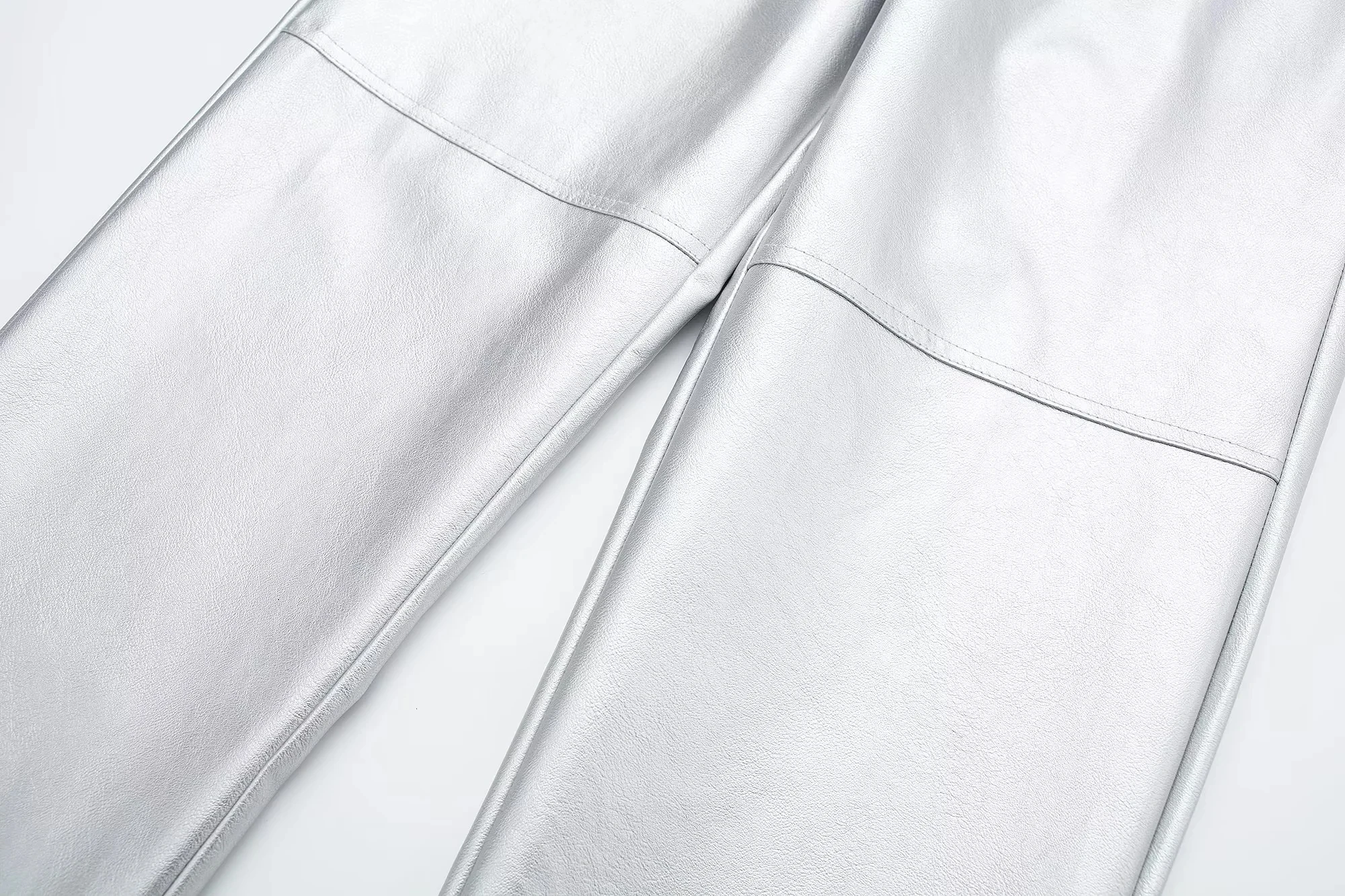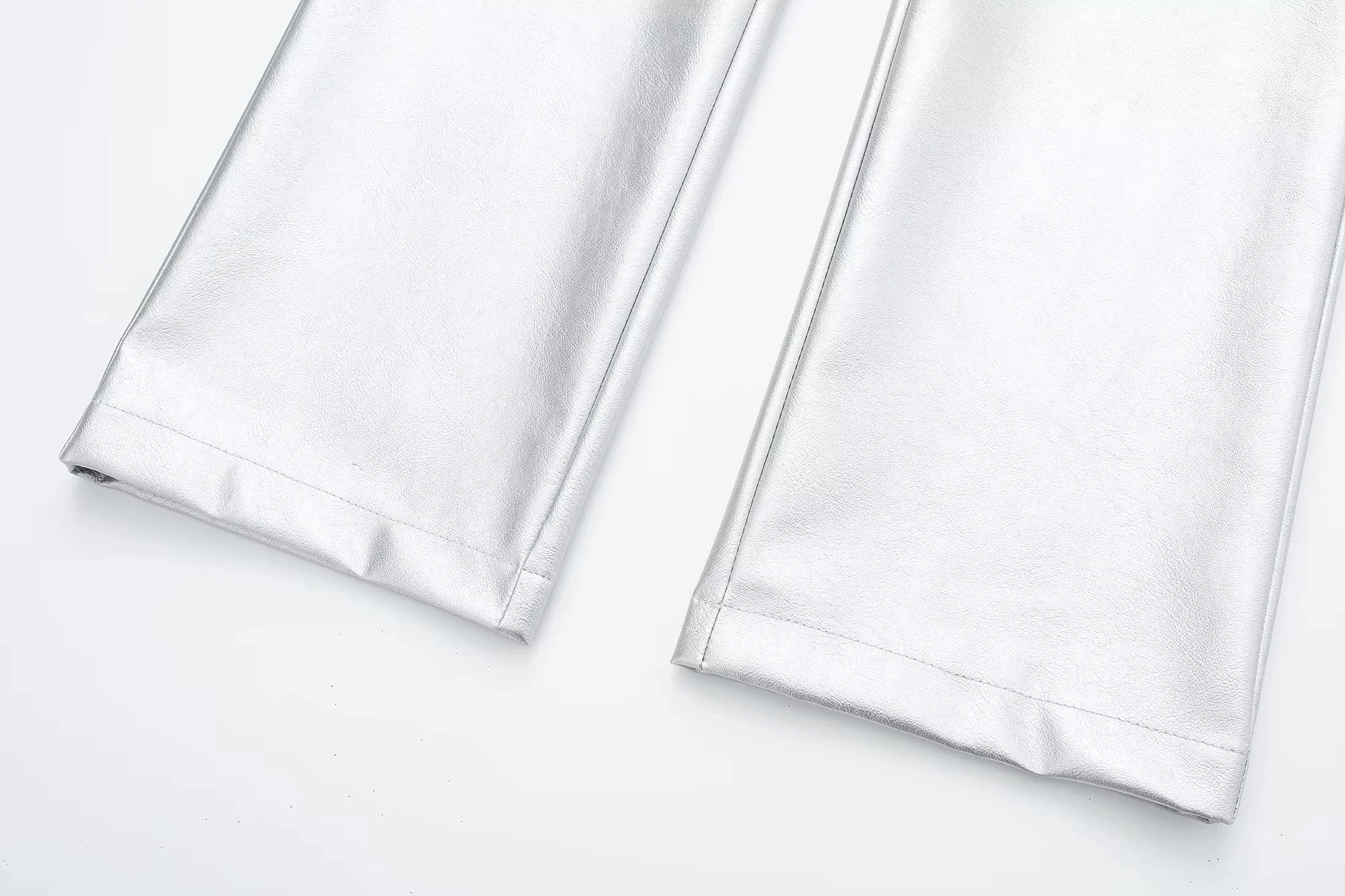 Pantalón plateado ideal para lucir un look muy diferente y brillante en una noche con tus amigas. El pantalón es recto, a la cintura y no estira.