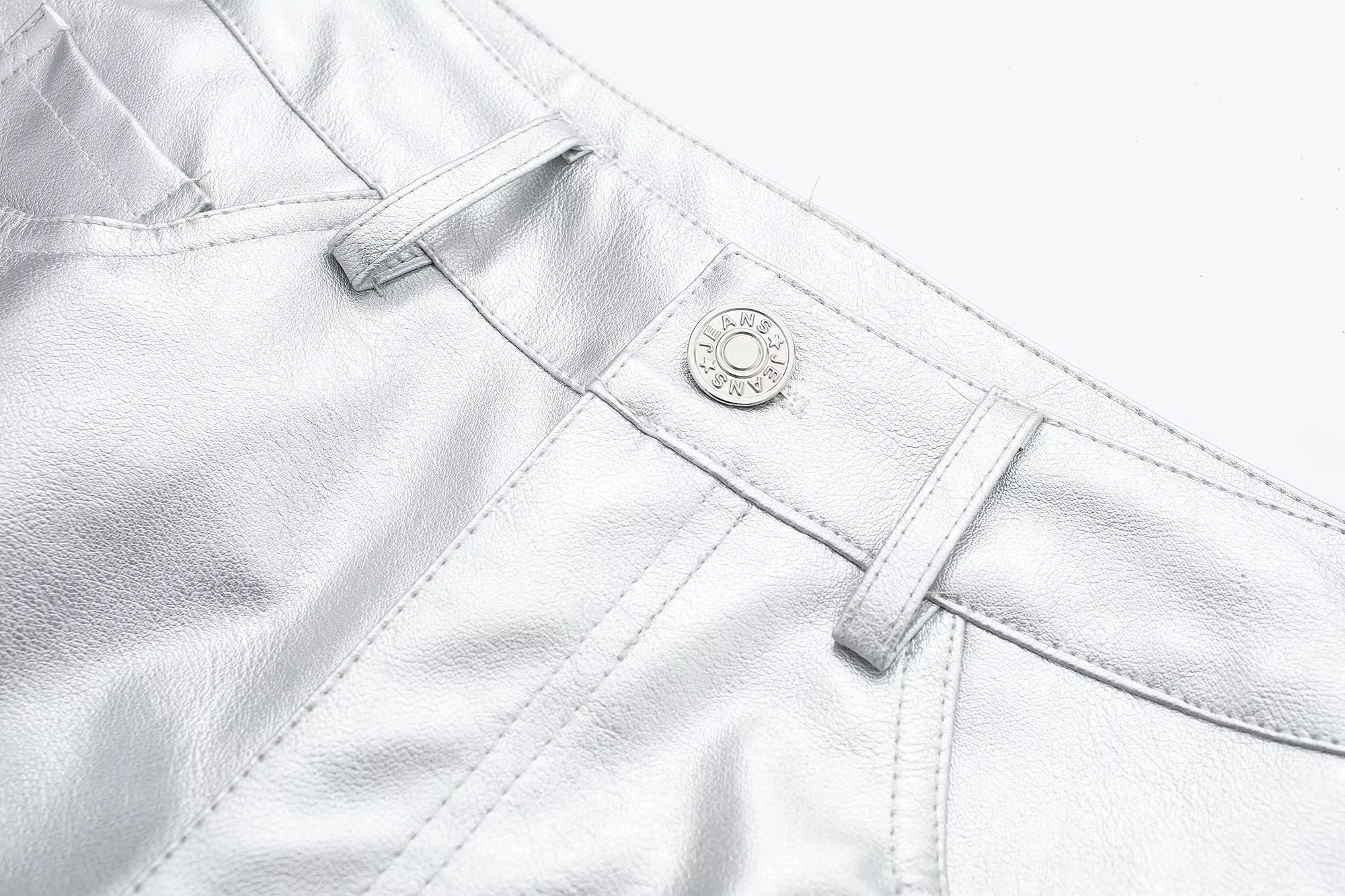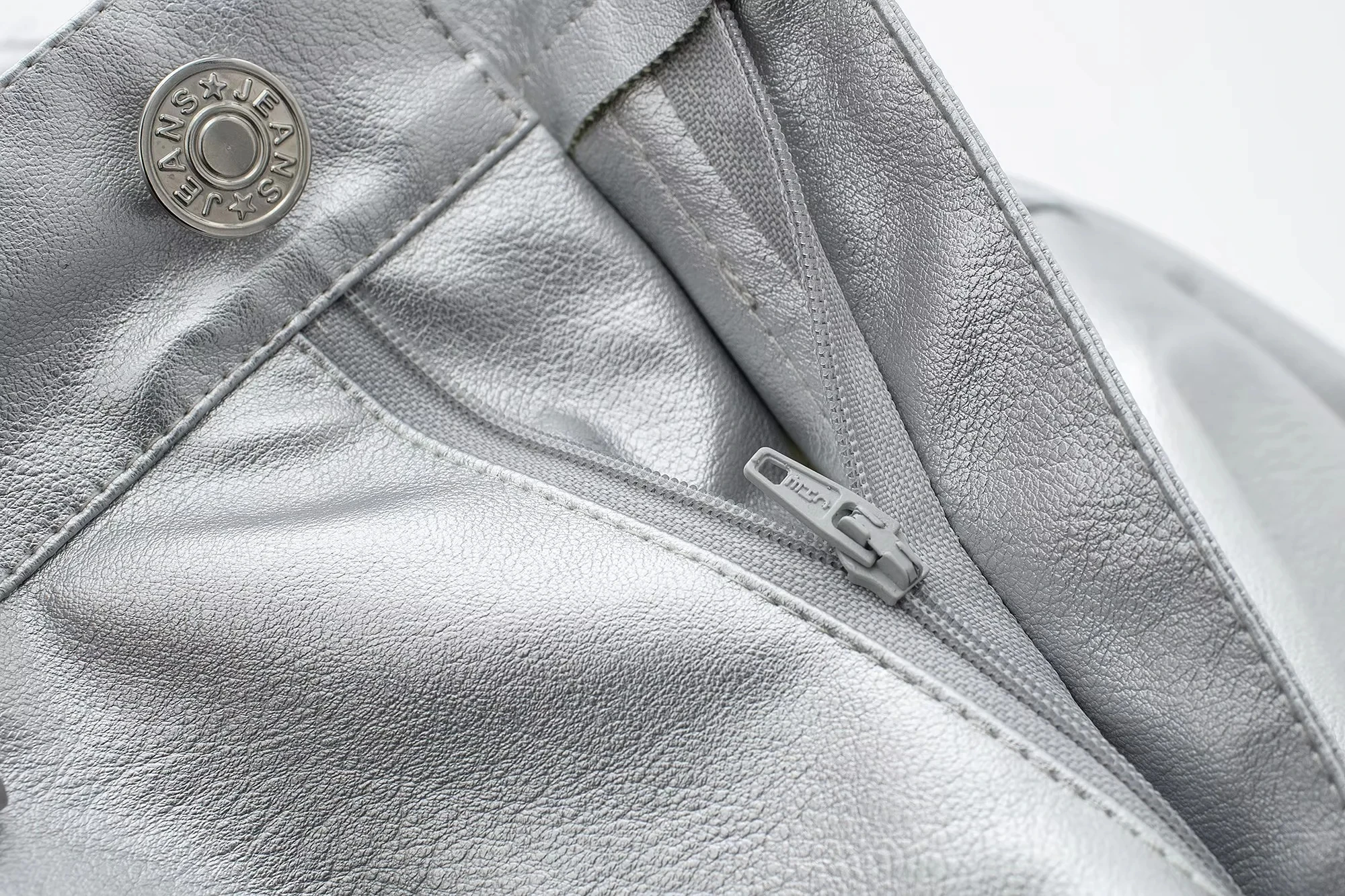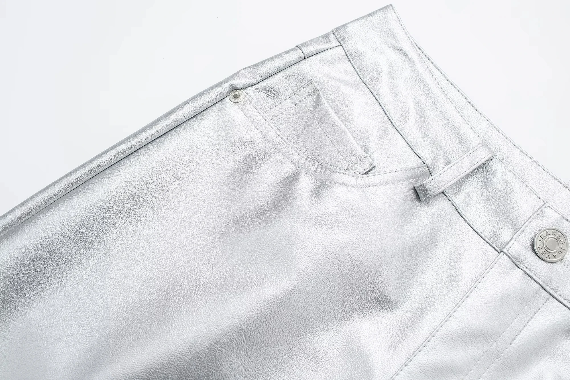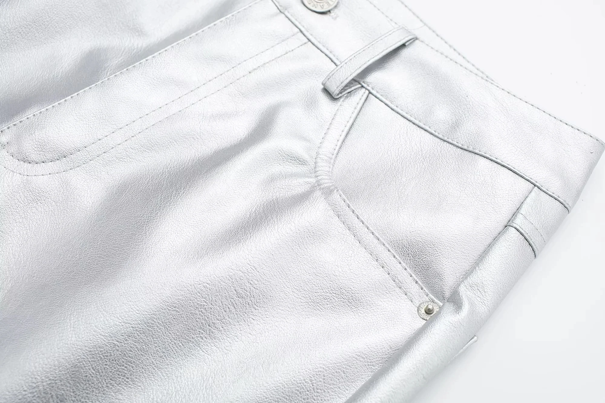 Pantalón plateado ideal para lucir un look muy diferente y brillante en una noche con tus amigas. El pantalón es recto, a la cintura y no estira.