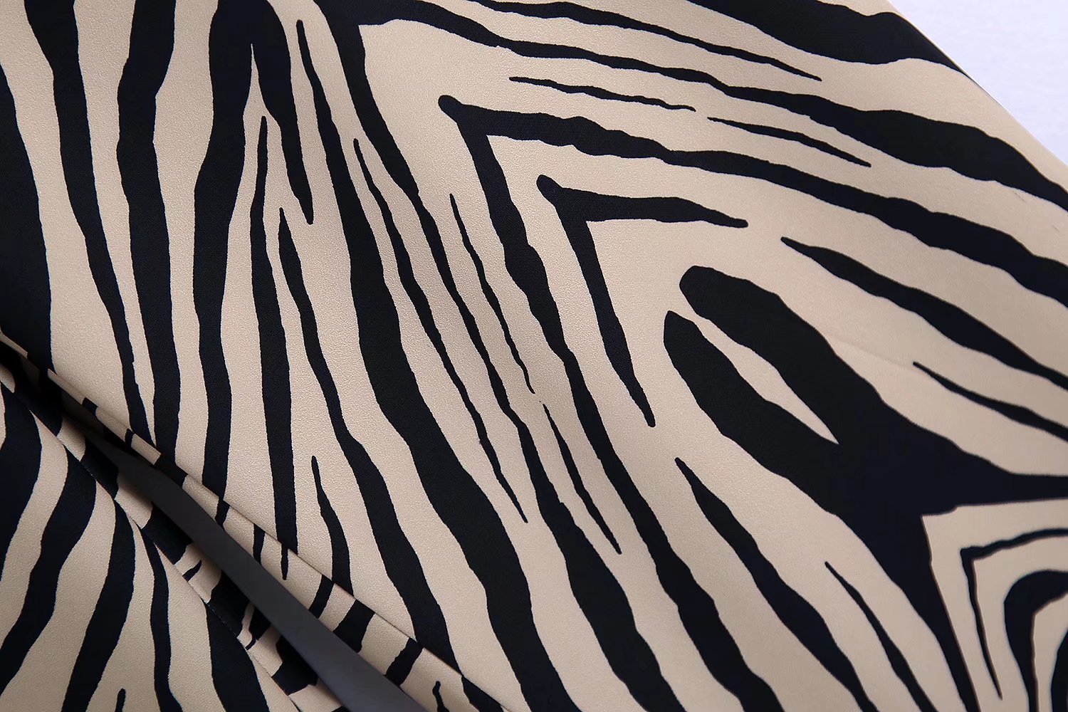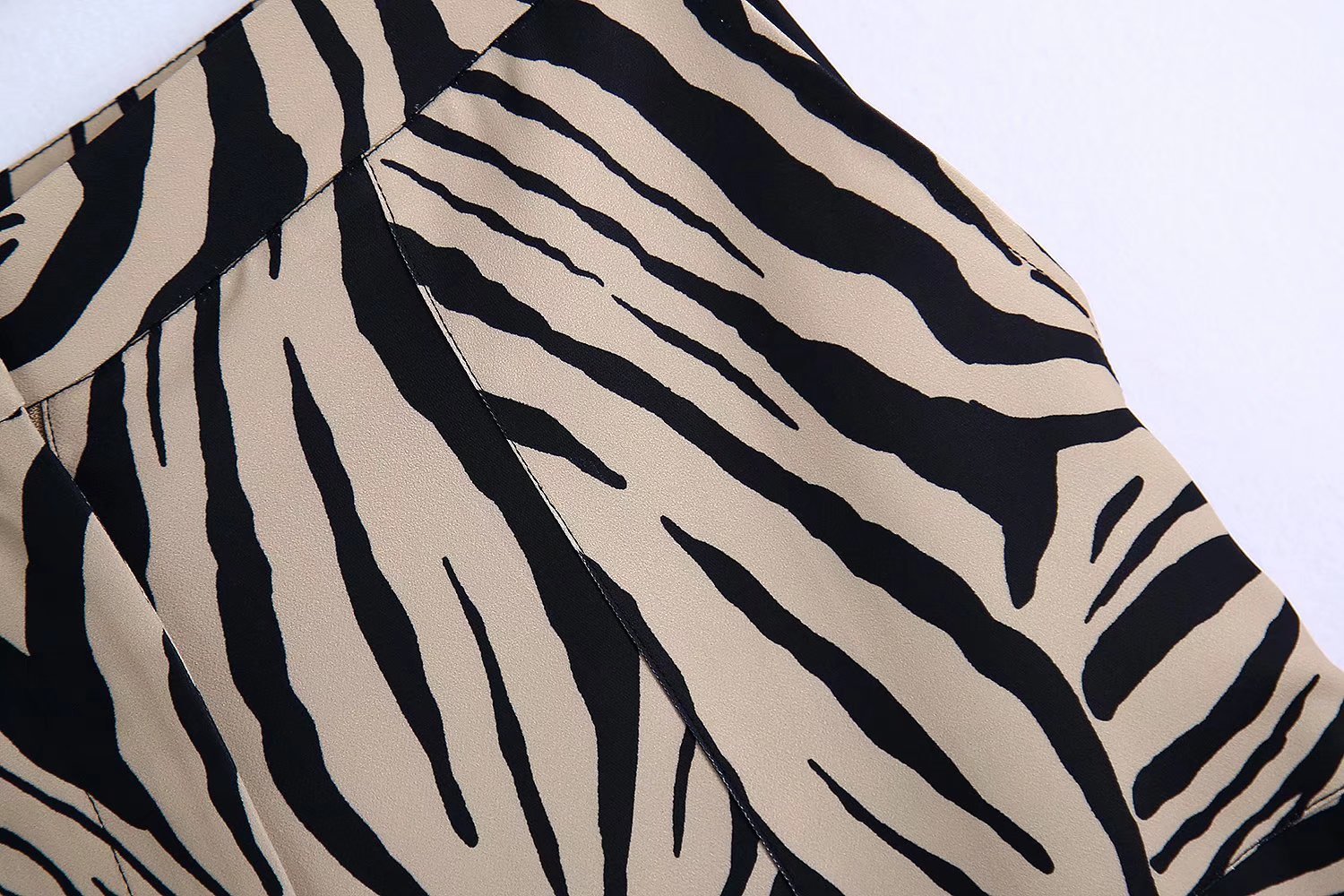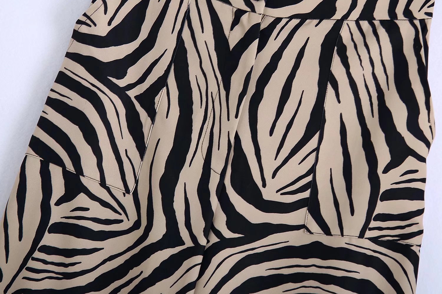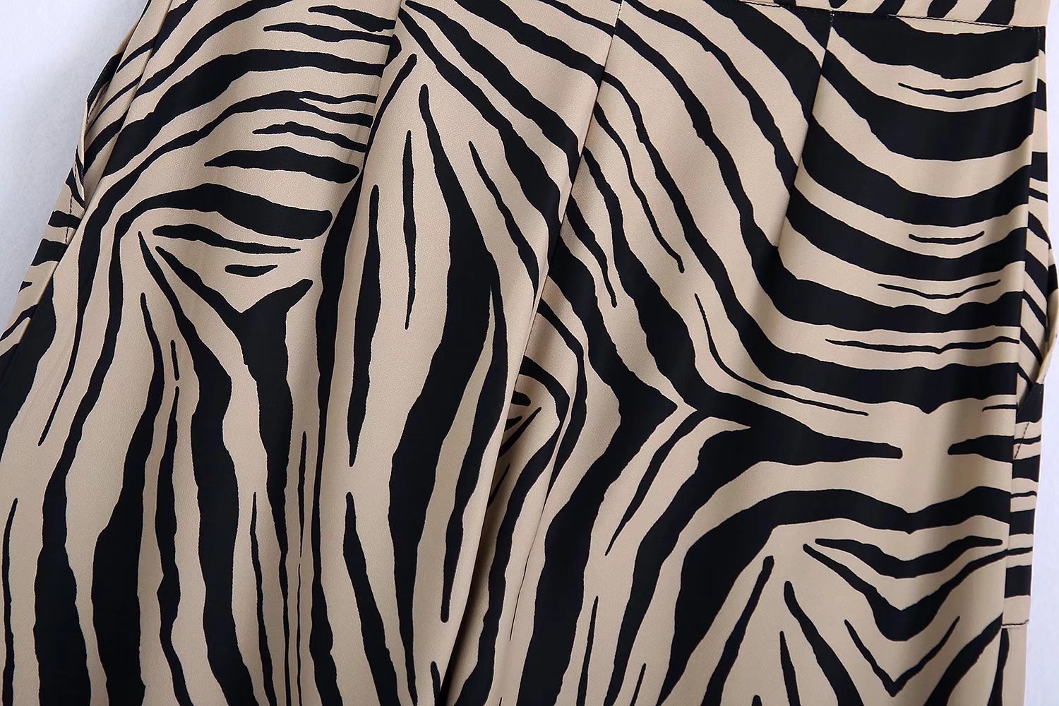 Un pantalón estilo trousers con impresión de animal print. El pantalón es a la cintura, se abrocha de botón y zipper, tiene bolsillos en los lados y su caída es holgada.