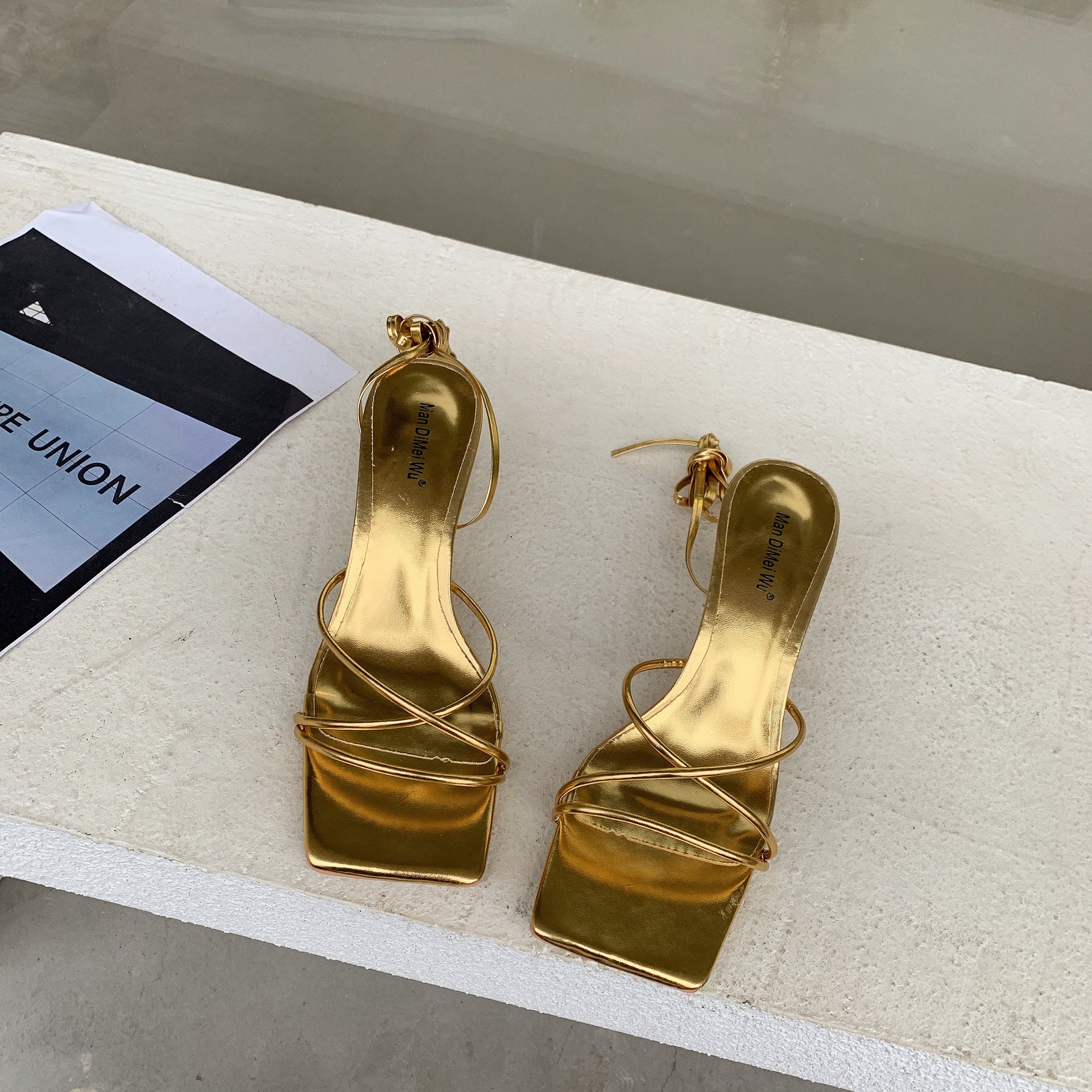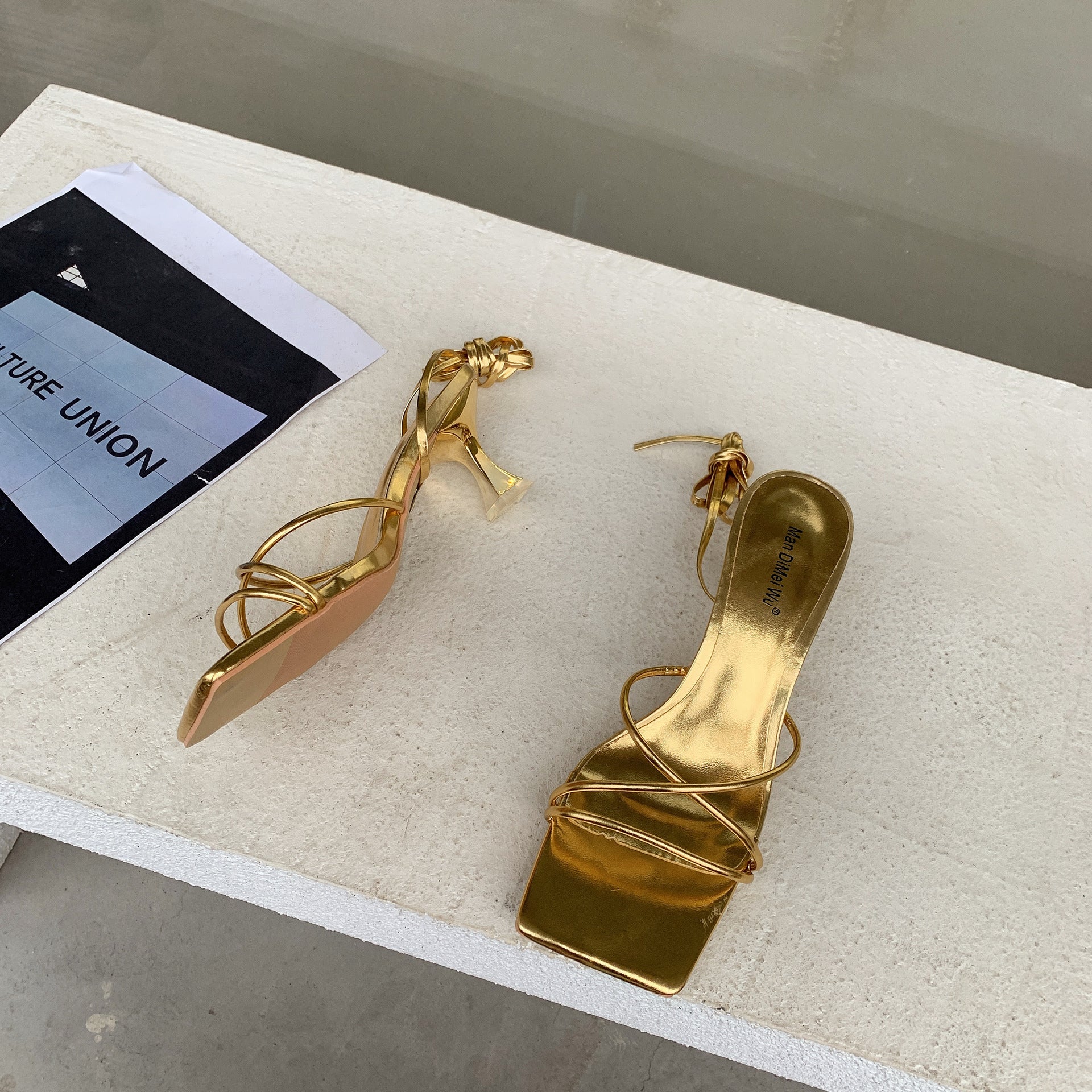 Sandalias de tacón divinas, con tiras que se pueden acomodar en la pierna de manera alargada o justo arriba del tobillo. La parte delantera del zapato tiene forma cuadrada.