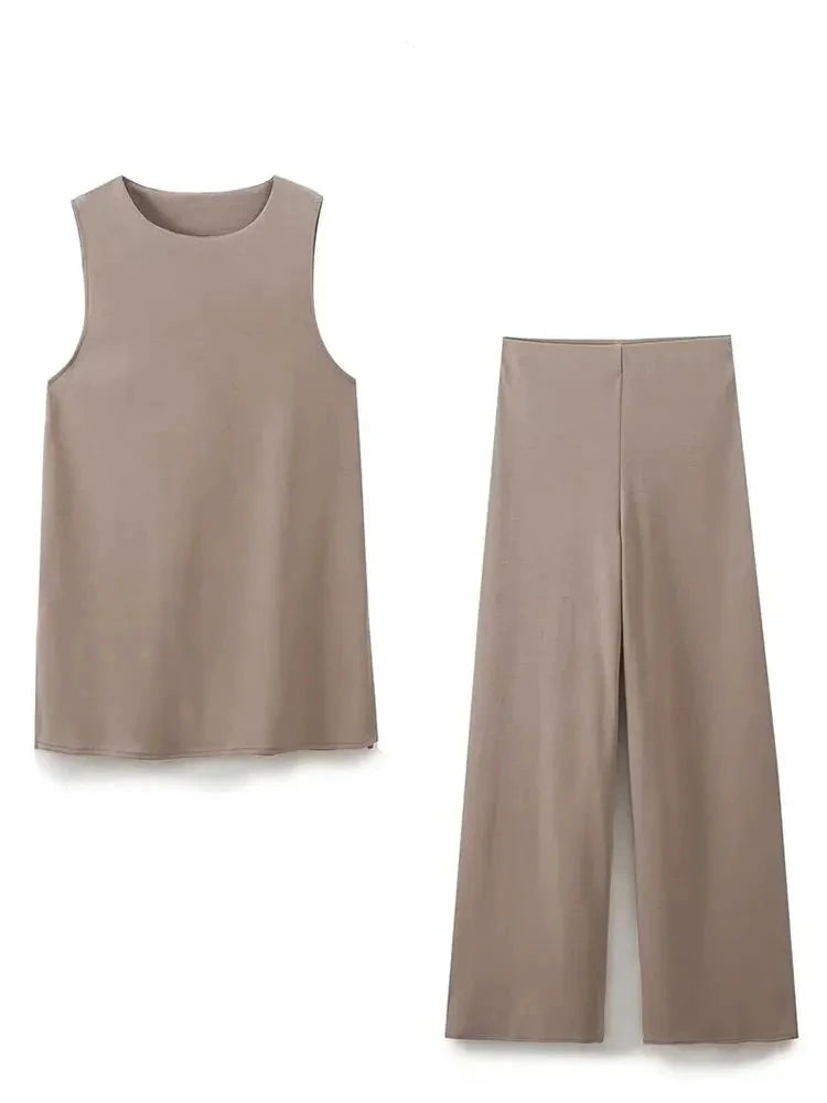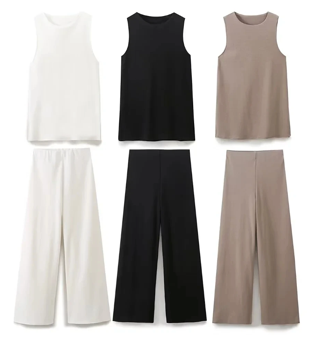 Se conforma de dos prendas: un top largo y holgado sin mangas y unos pantalones que caen estilo trousers de la cintura hasta el suelo y tienen elastico. Ideal para estar a la moda este otoño.