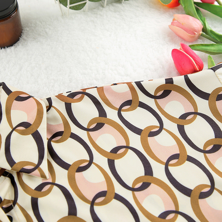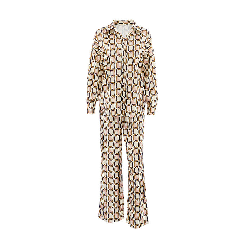 Este set de tela suave incluye una camisa de manga larga y de botones y un pantalón largo con elástico en la cintura. Ambas prendas son holgadas.