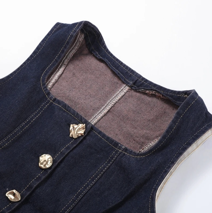 Un set en tendencia. Top y jeans de mezclilla. El top tiene unos botones dorados increibles. El jeans es holgado. El tono de la mezclilla es oscuro.