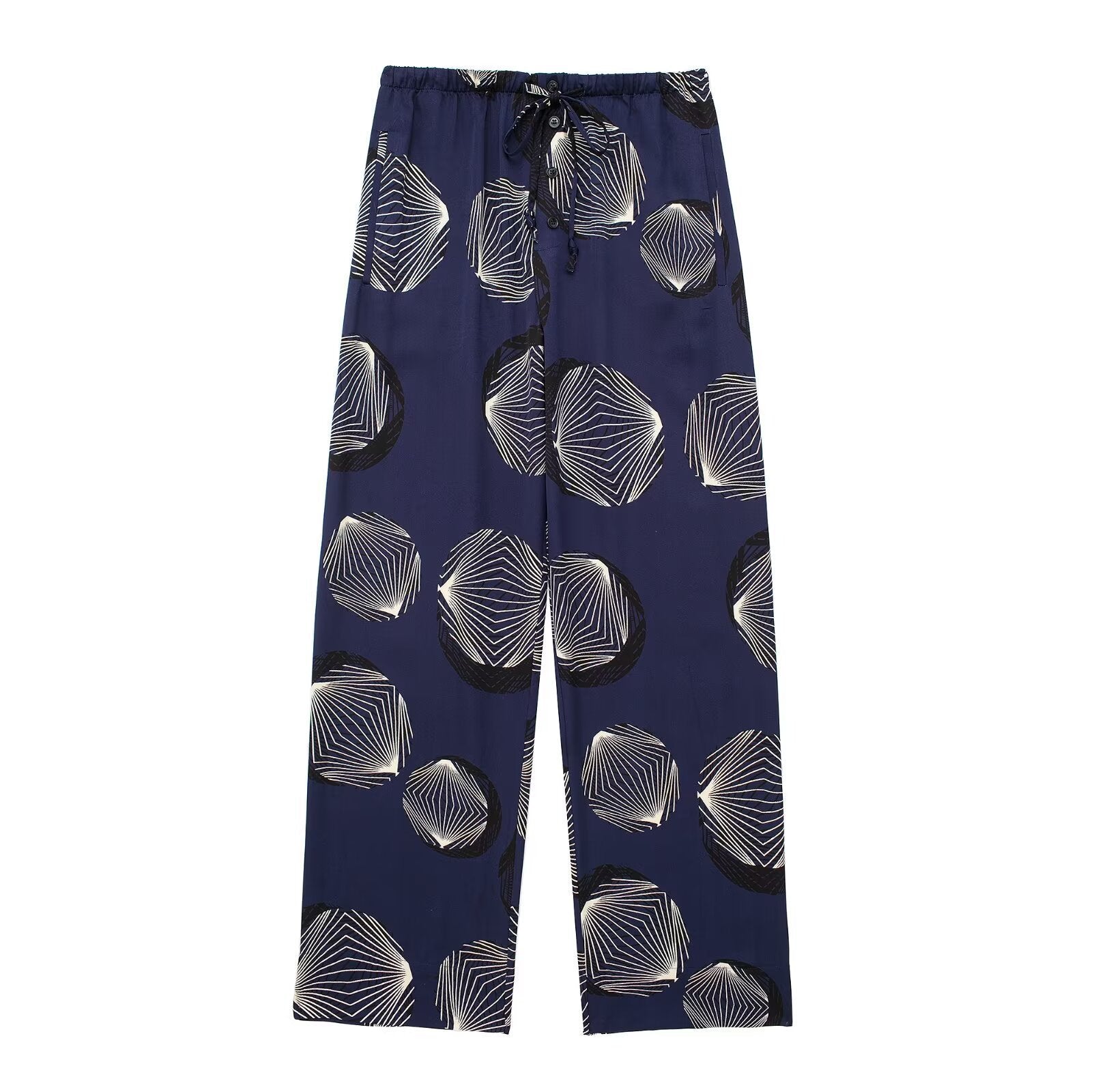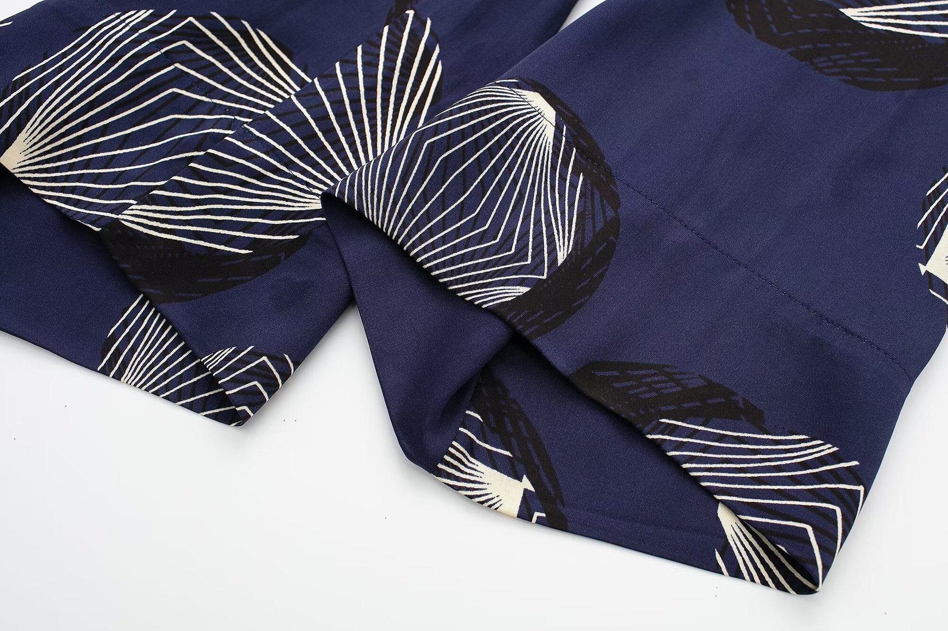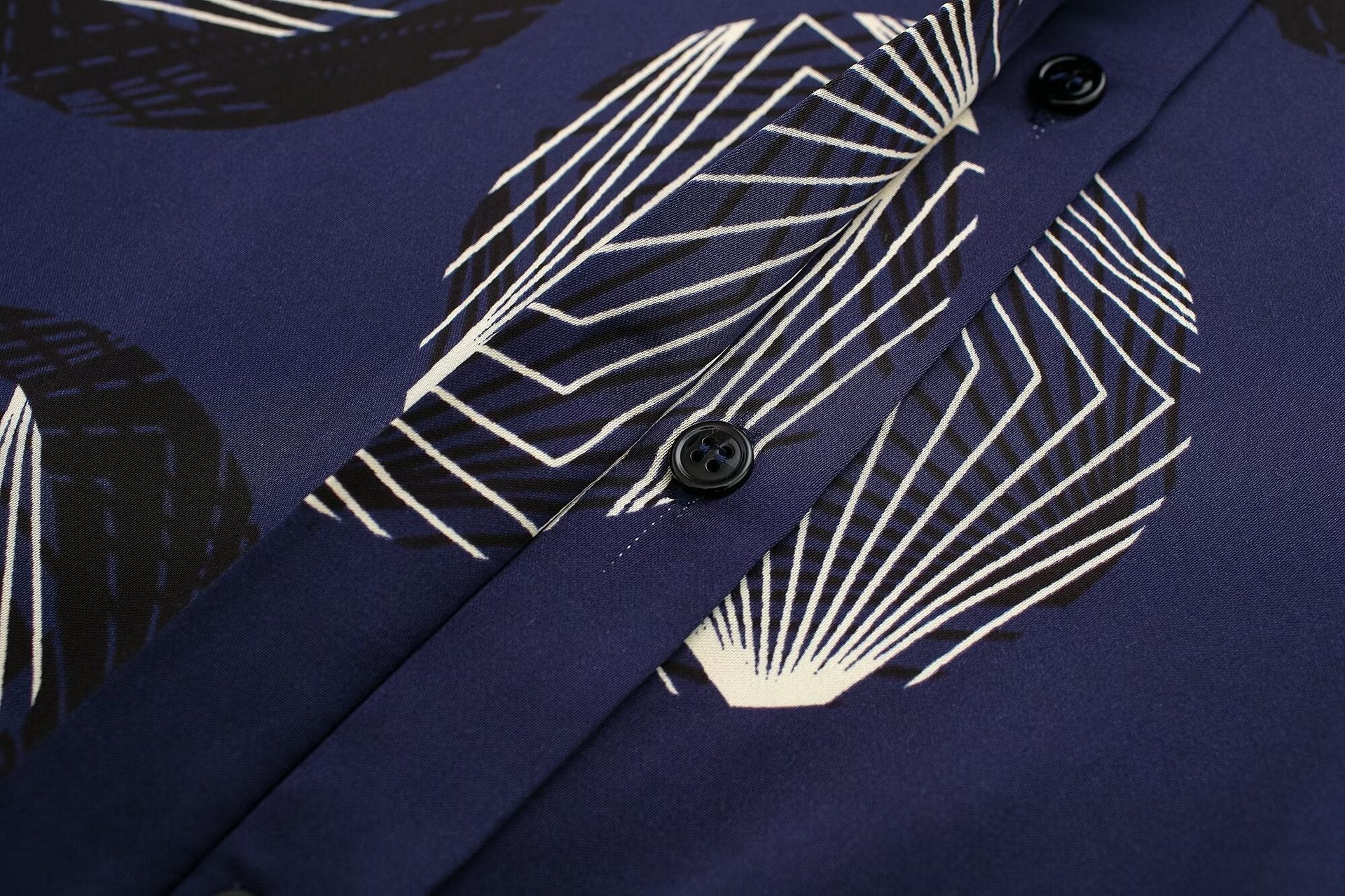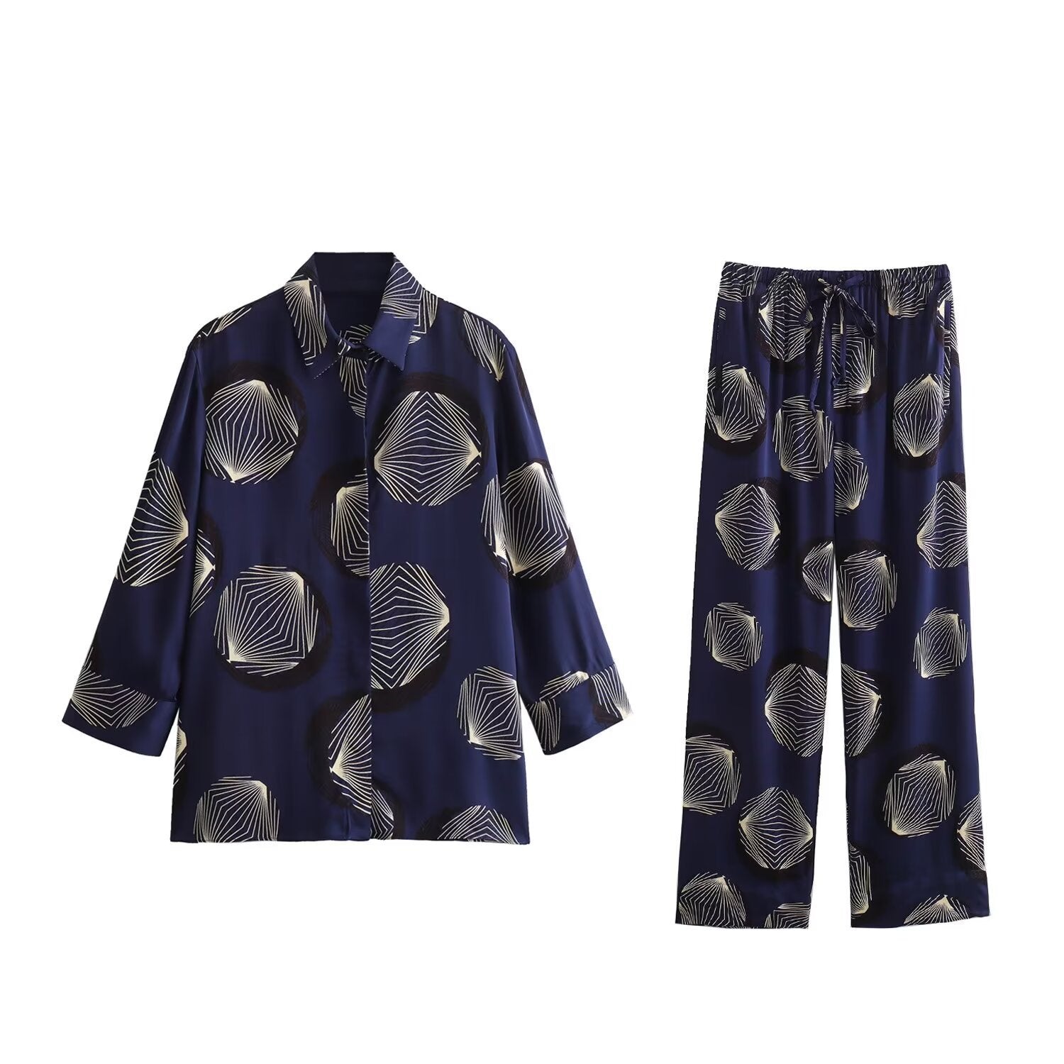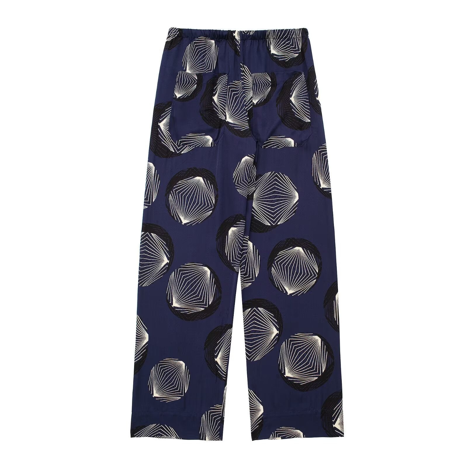 Este set es color azul marino con círculos negros que tienen print de líneas blancas que forman una figura irregular.