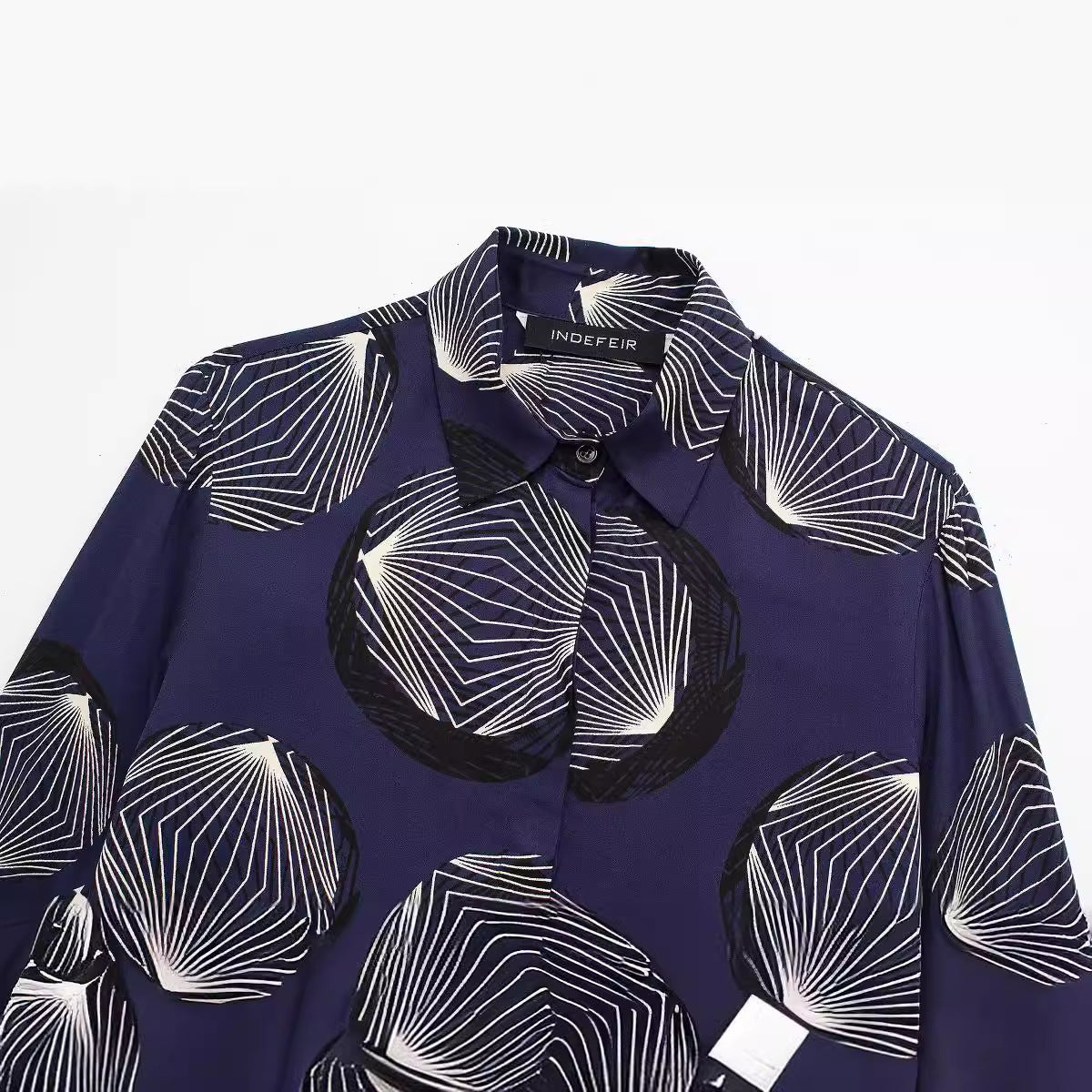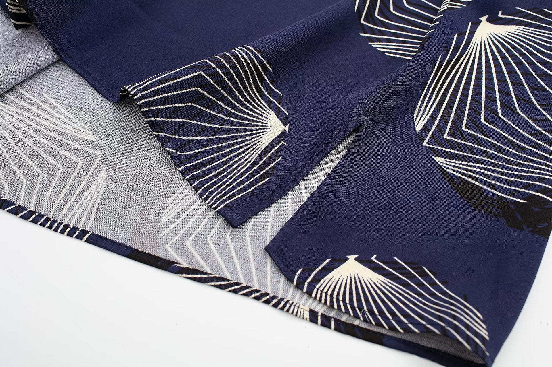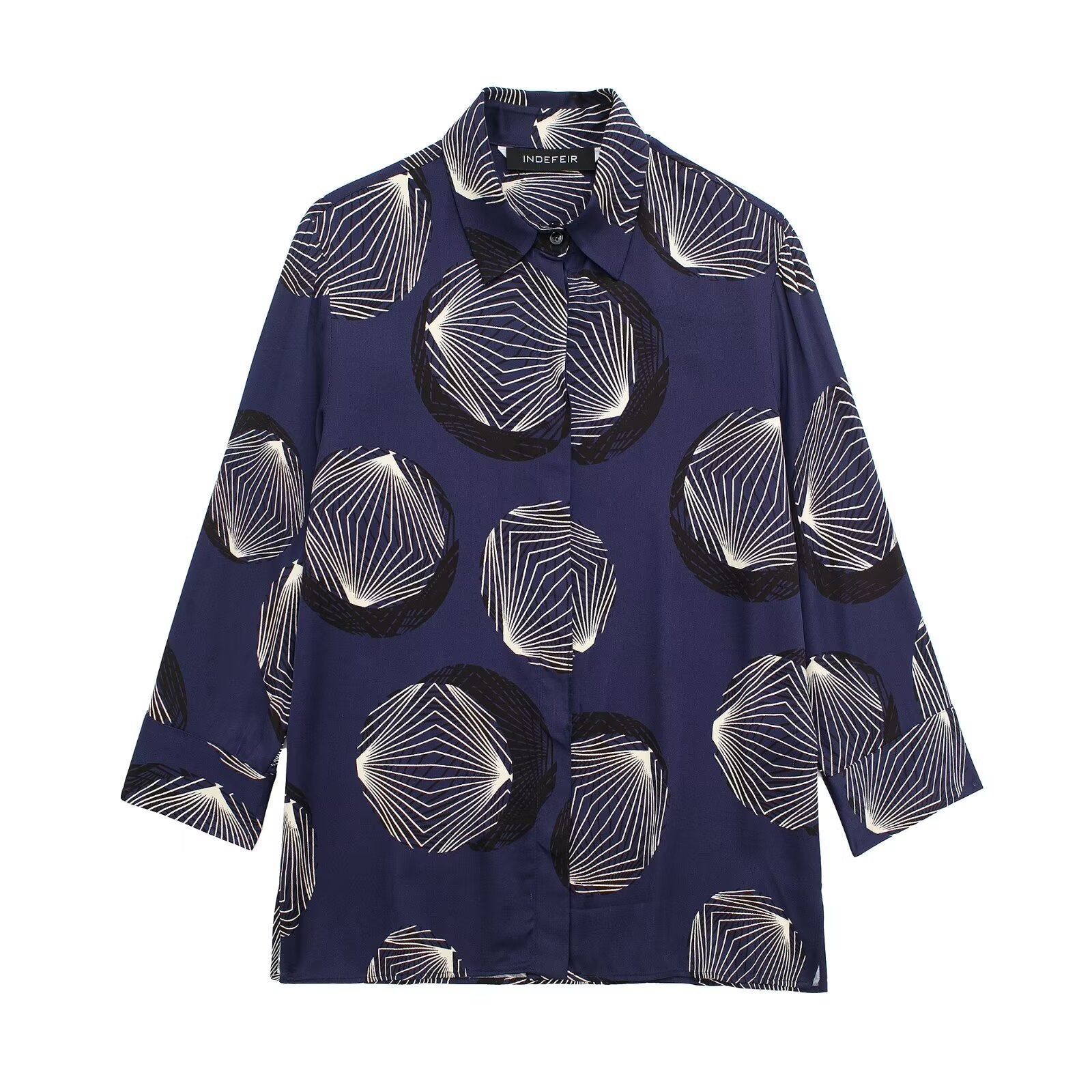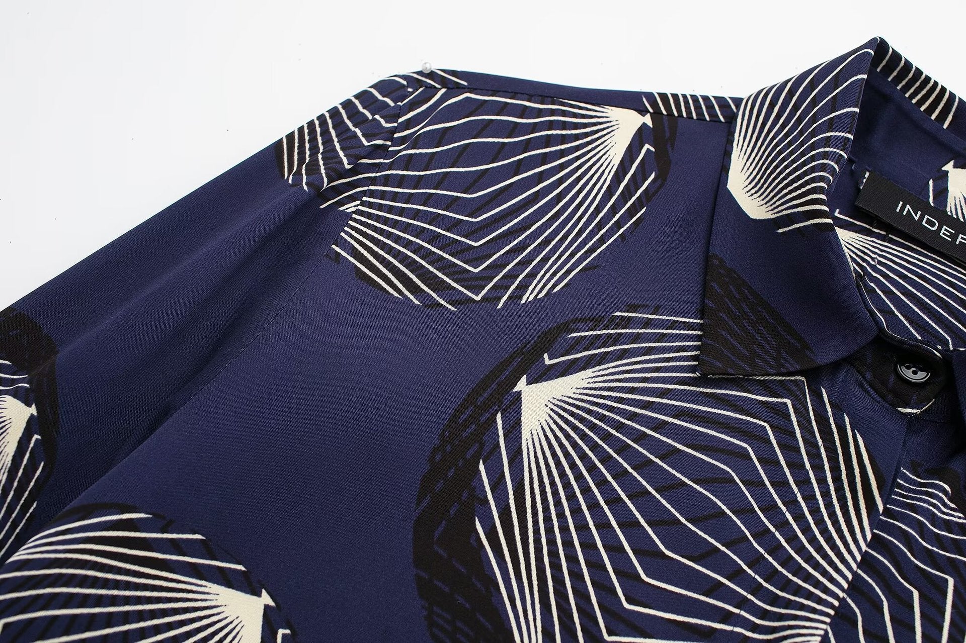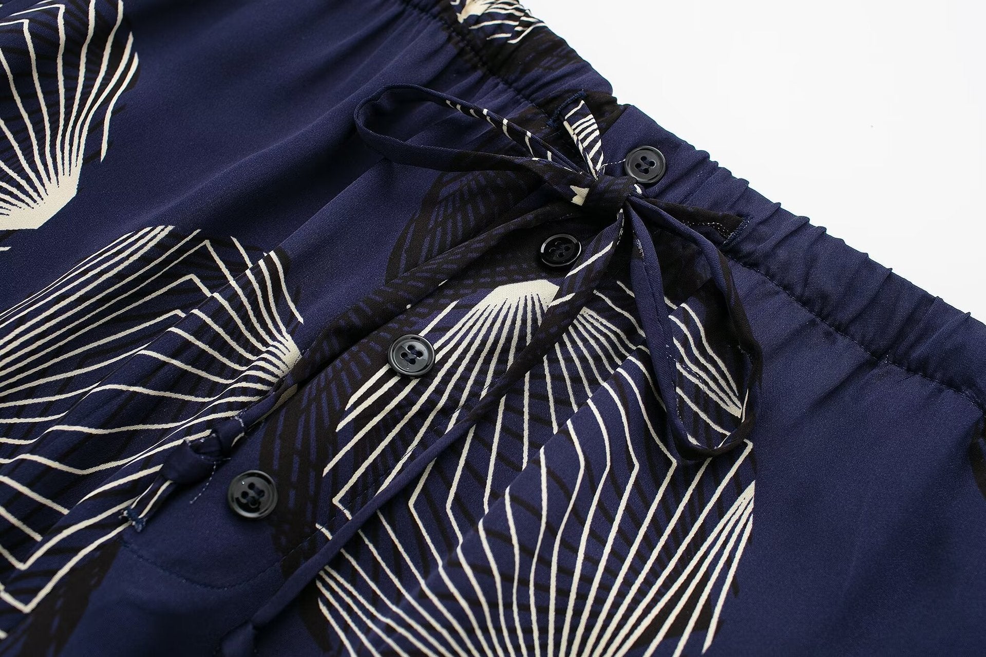 Este set es color azul marino con círculos negros que tienen print de líneas blancas que forman una figura irregular.