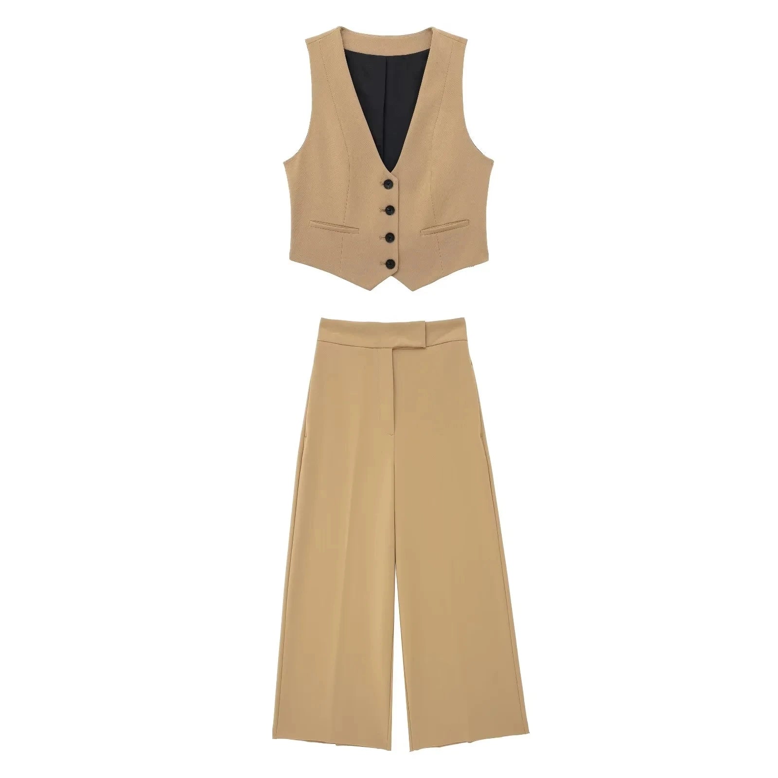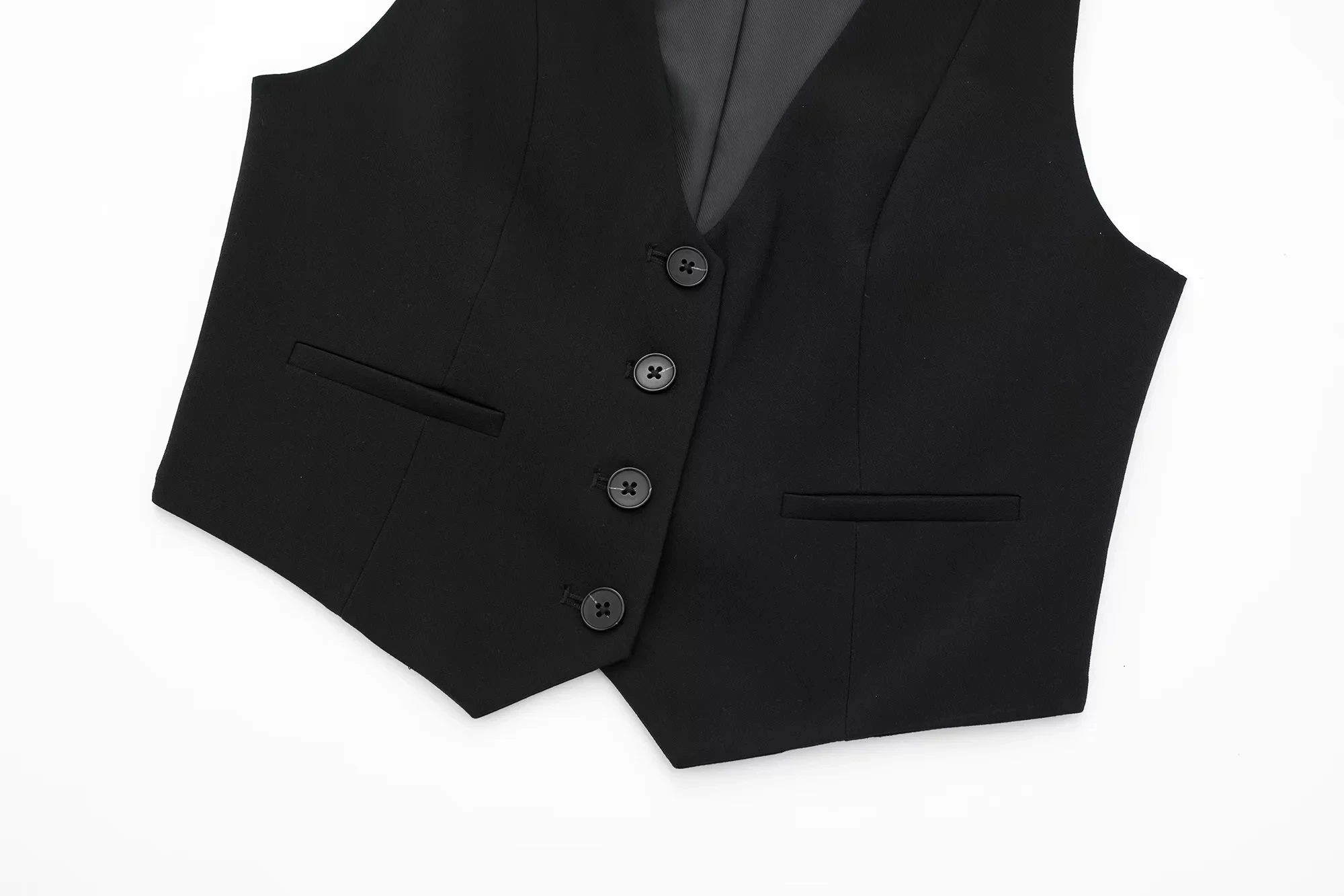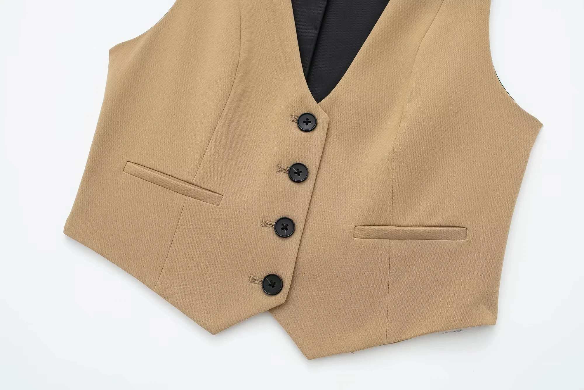 Este set es ideal para lucir linda y formal en el verano. El chaleco tiene el cuello V, sin mangas, tiene 4 botones, forro y dos bolsas cerradas. El pantalón es a la cintura, se abrocha por el centro con zipper, botón y gancho y tiene largo pescador (un poco más arriba del tobillo).