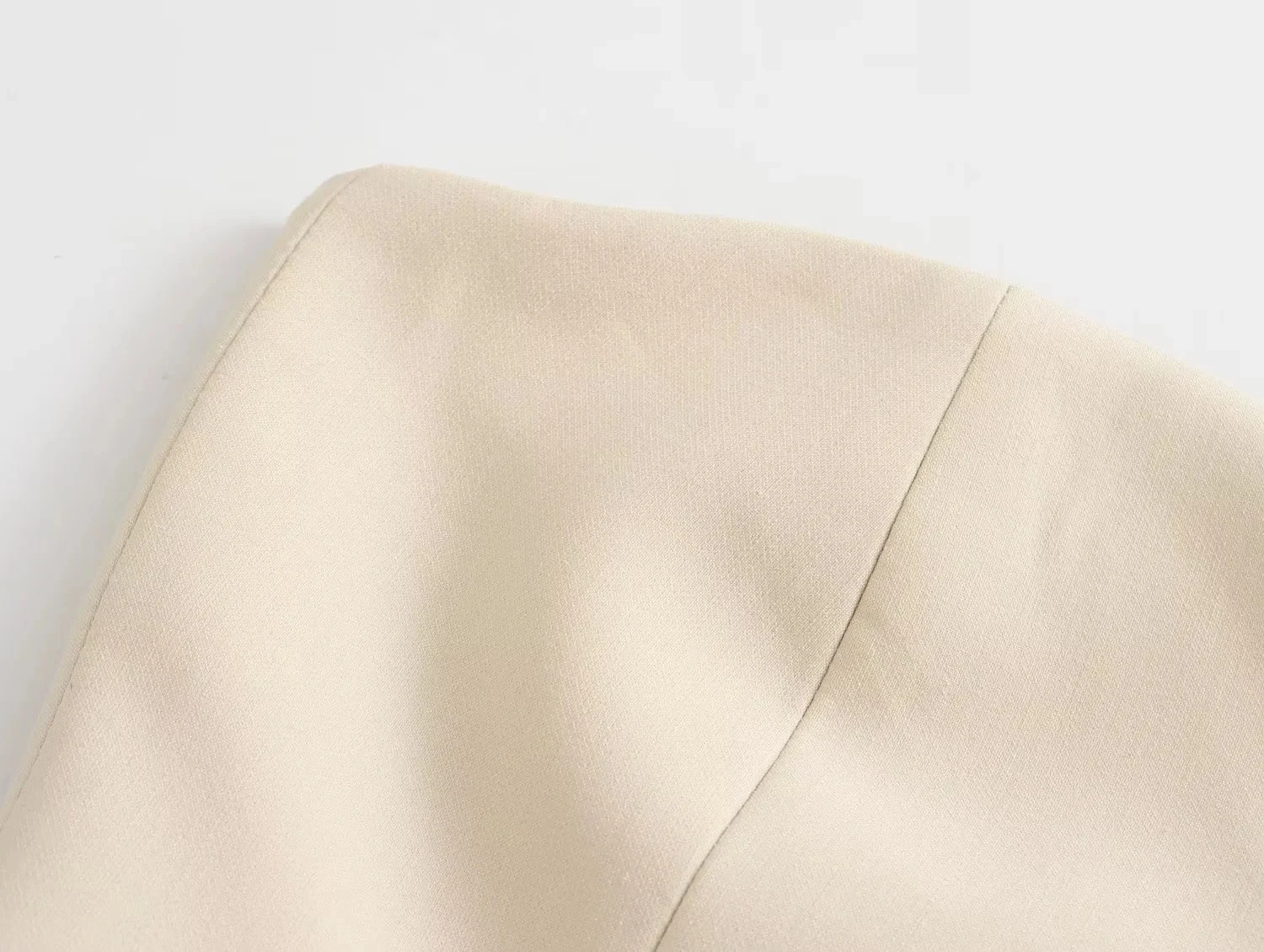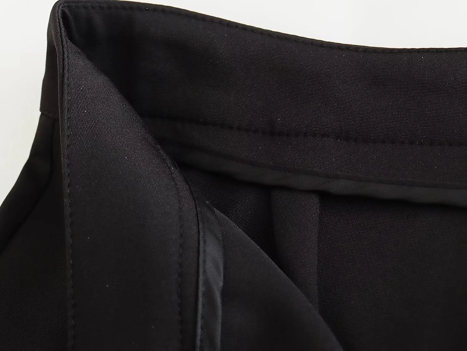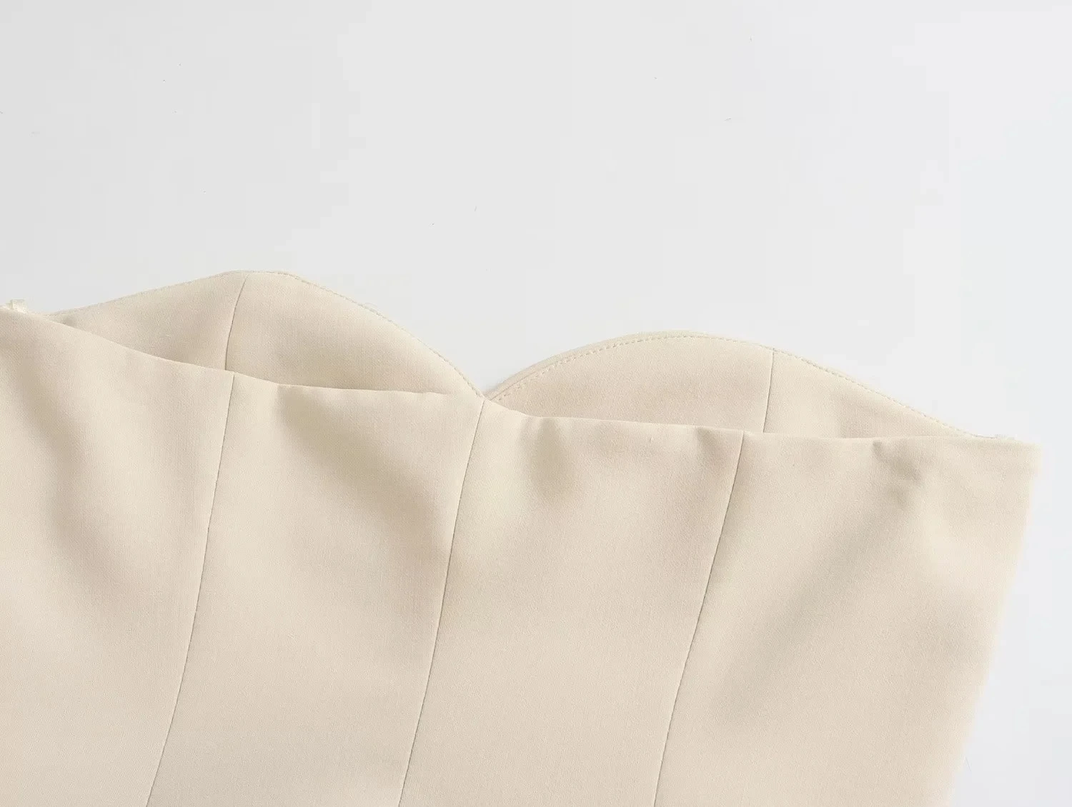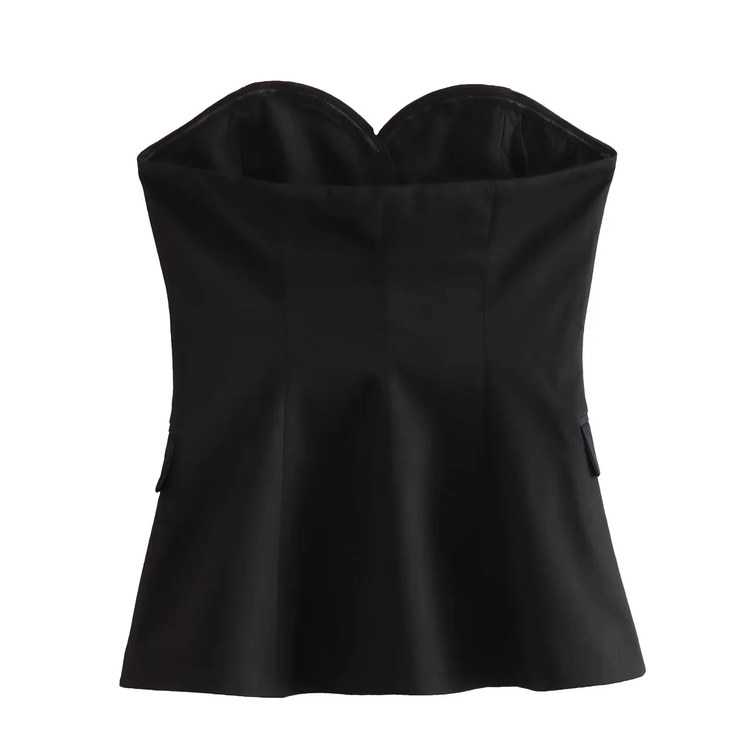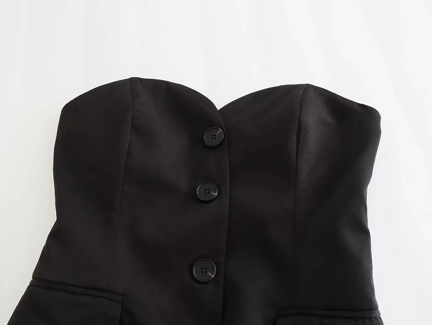 El top esta muy diferente a lo que se ve normalmente. Es strapless, tiene 4 botones, dos bolsillos cosidos, se marca la cintura. El pantalón es largo y recto, va a la cintura, tiene botón al centro.