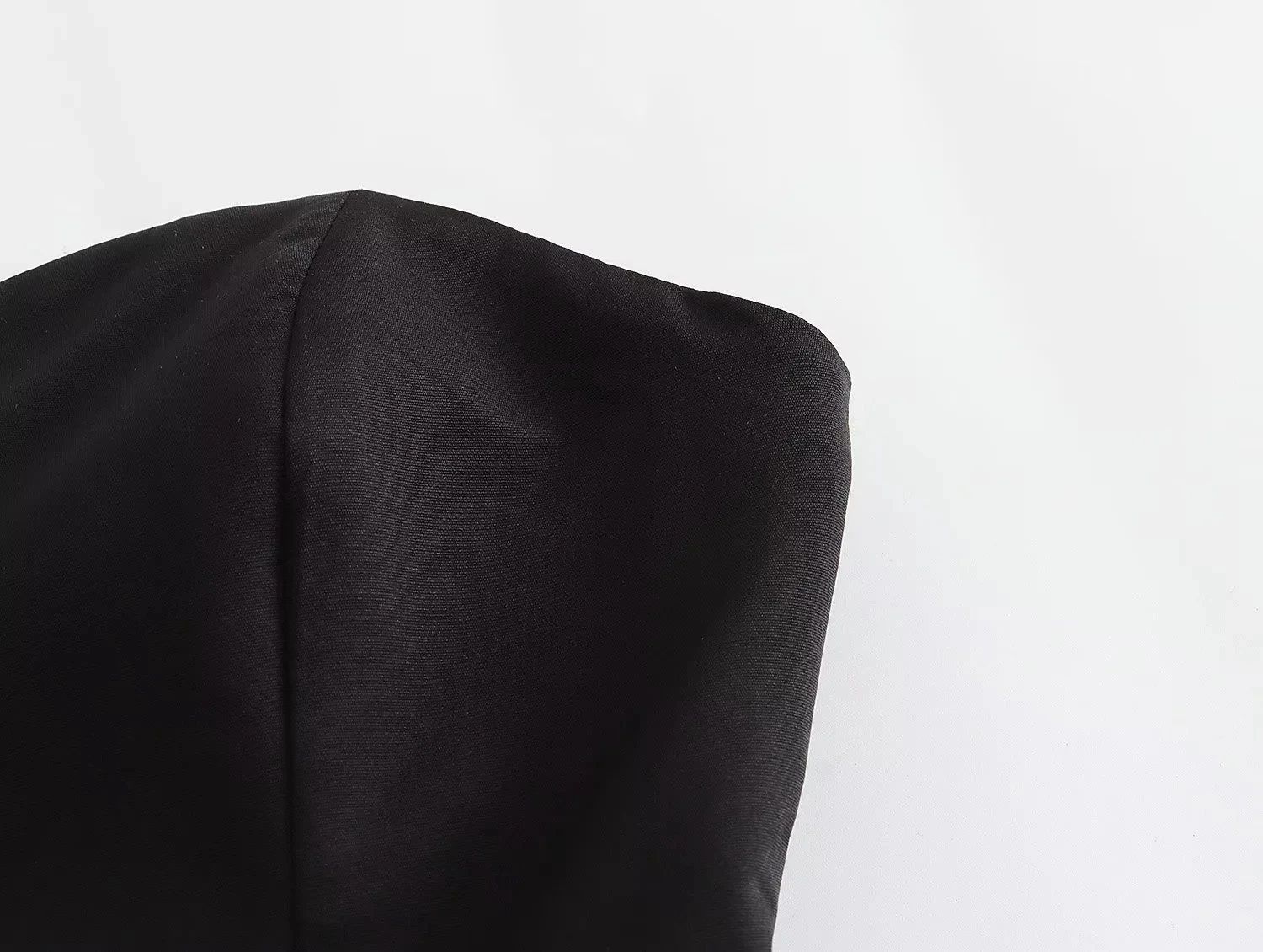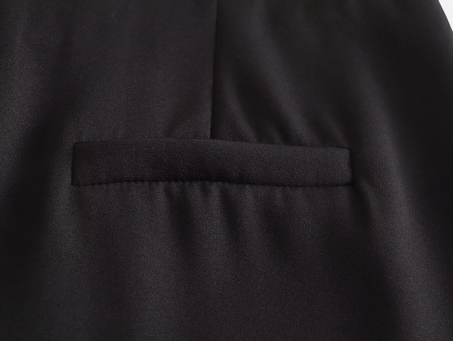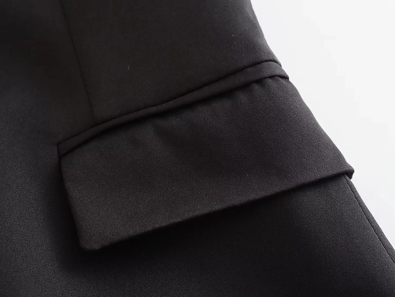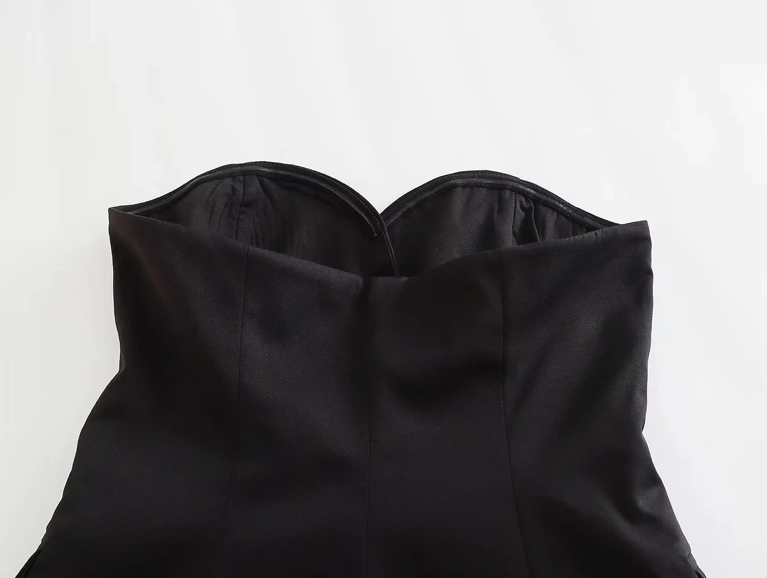 El top esta muy diferente a lo que se ve normalmente. Es strapless, tiene 4 botones, dos bolsillos cosidos, se marca la cintura. El pantalón es largo y recto, va a la cintura, tiene botón al centro.