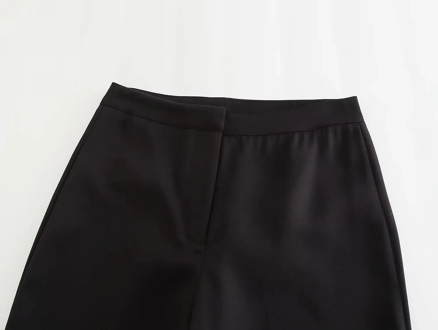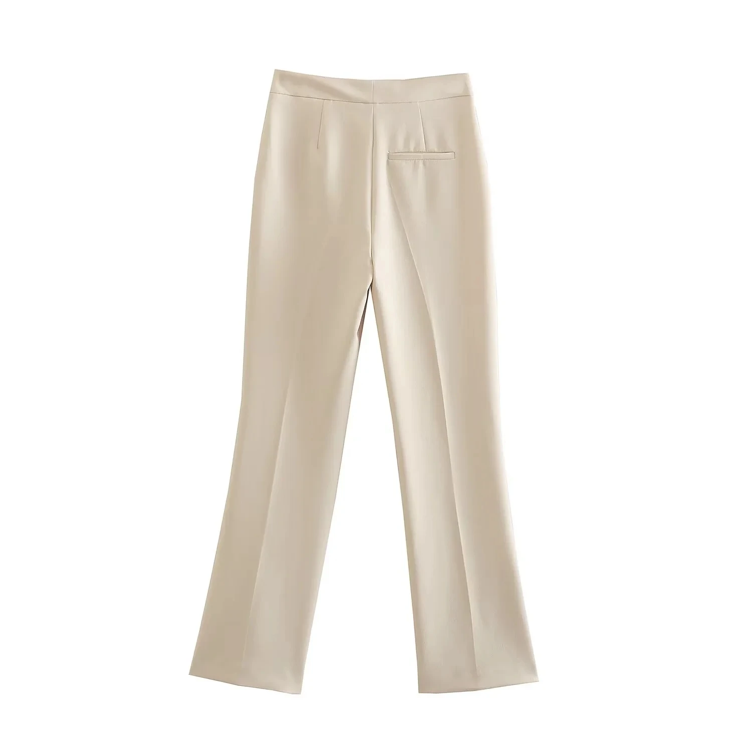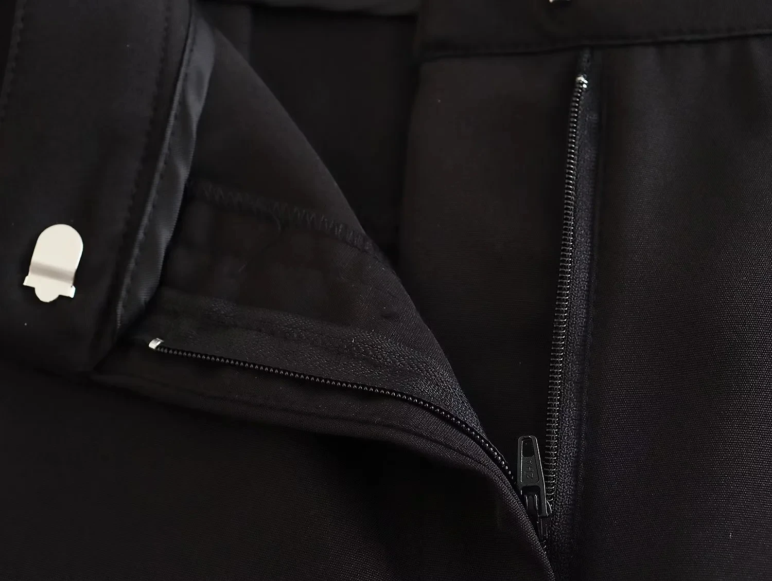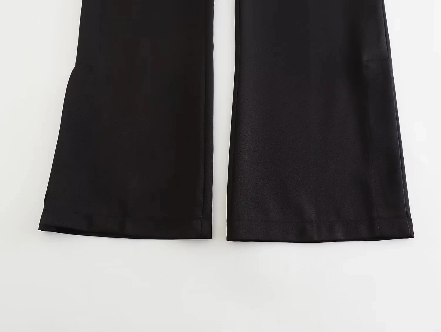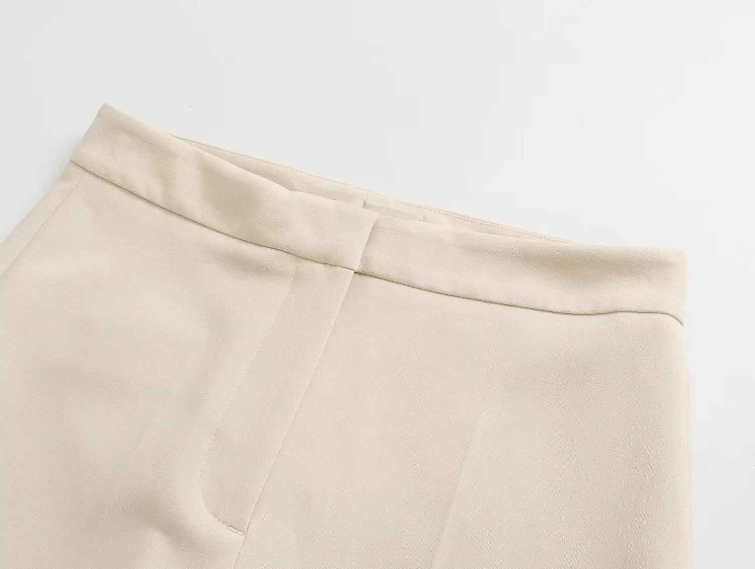 El top esta muy diferente a lo que se ve normalmente. Es strapless, tiene 4 botones, dos bolsillos cosidos, se marca la cintura. El pantalón es largo y recto, va a la cintura, tiene botón al centro.