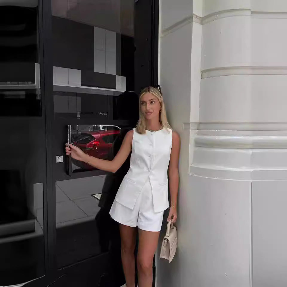 Set blanco de chaleco largo es sin mangas que se abrocha solo de la mitad superior con 4 botones.