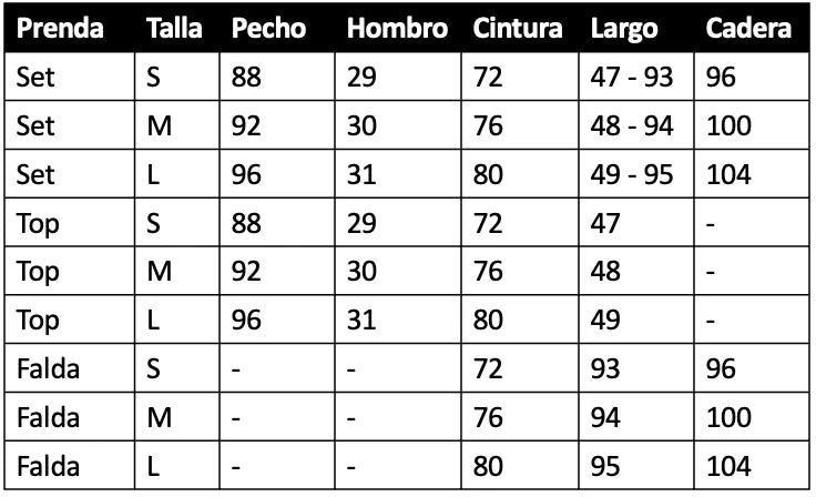 Tabla de medidas (cm):