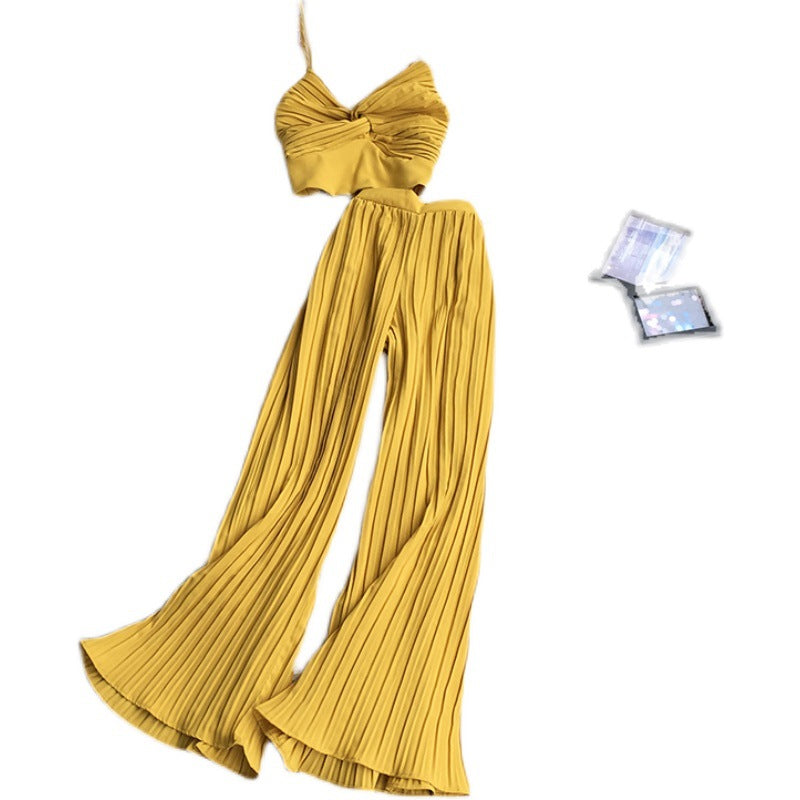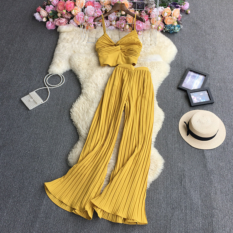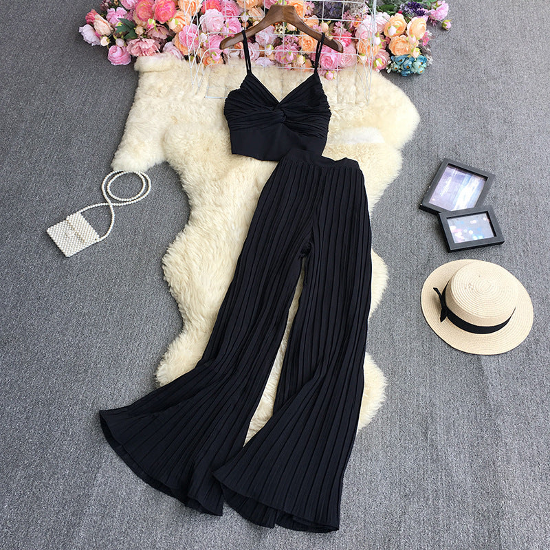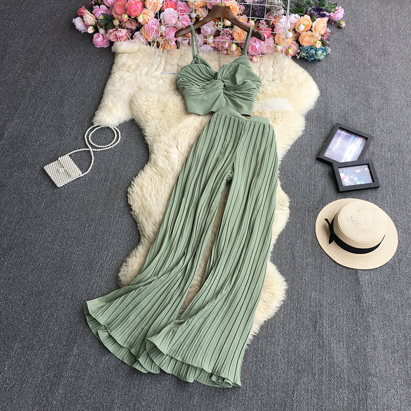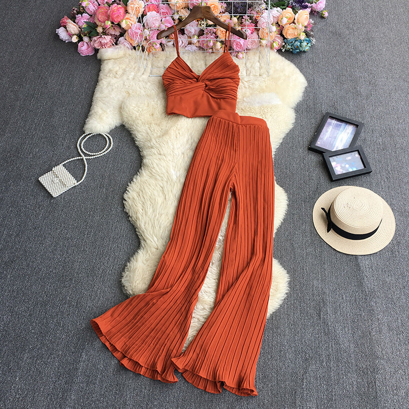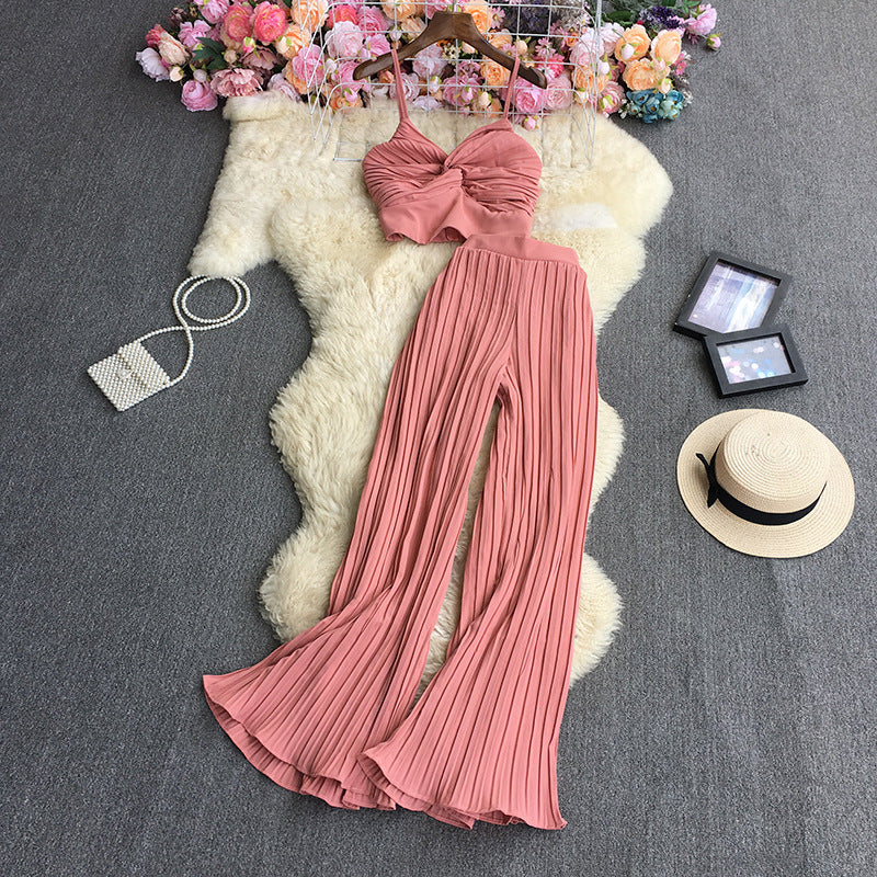 Un set muy lindo y coqueto conformado por un crop top de tirantes con un giro en la tela, se abrocha en la parte de atrás con un zipper. También tiene un pantalón a la cintura que cae hasta el suelo y se acampana hasta quedar muy holgado en la parte de abajo. La tela se conforma por tablones.