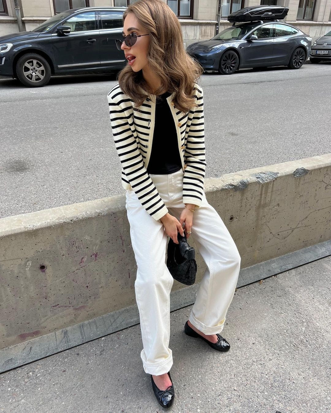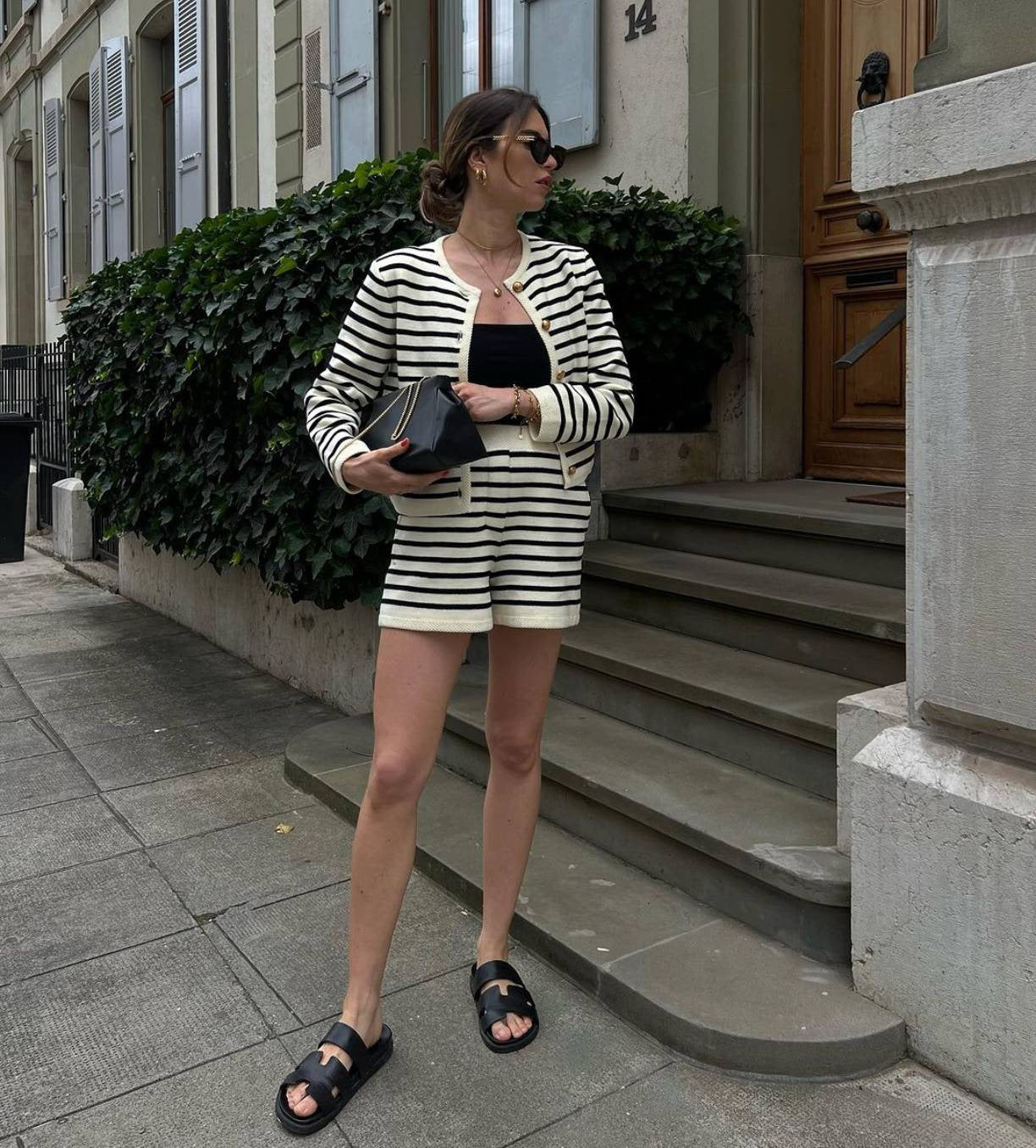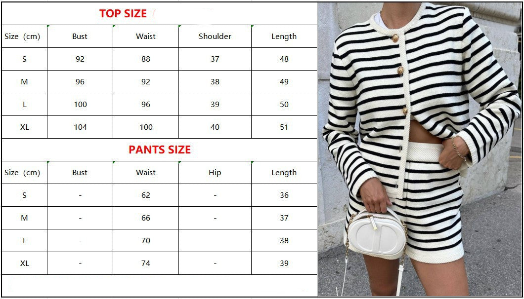 El set incluye un jersey de manga larga y botones dorados + unos shorts cortos, ambos son blancos con print de rayas horizontales negras que dan un toque elegante y son del estilo cárdigan de punto.