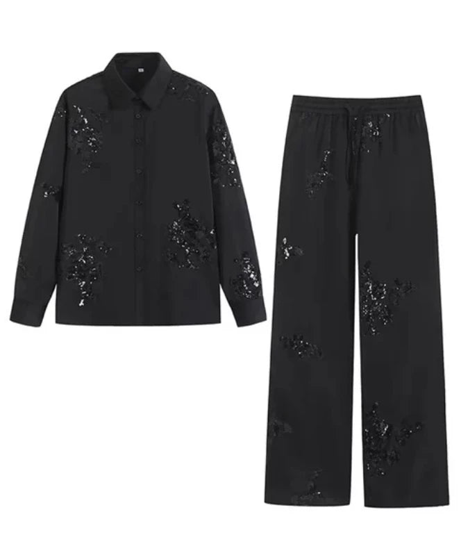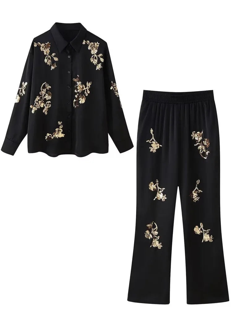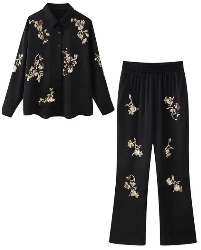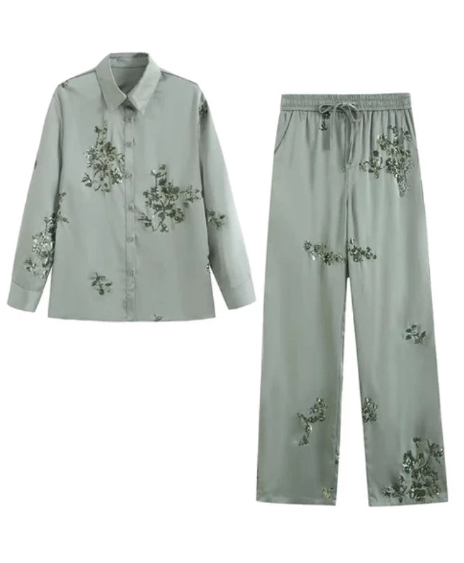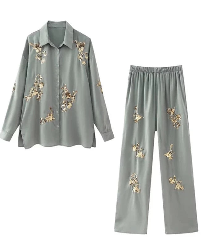 El set se conforma de una camisa de manga larga que se pueden arremangar y de botones, también de un pantalón de la cintura al tobillo.