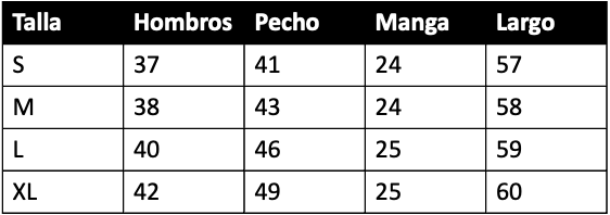 *Recomendamos revisar la tabla de medidas antes de realizar la compra. Si tienes dudas entre dos medidas, te recomendamos elegir la más grande.