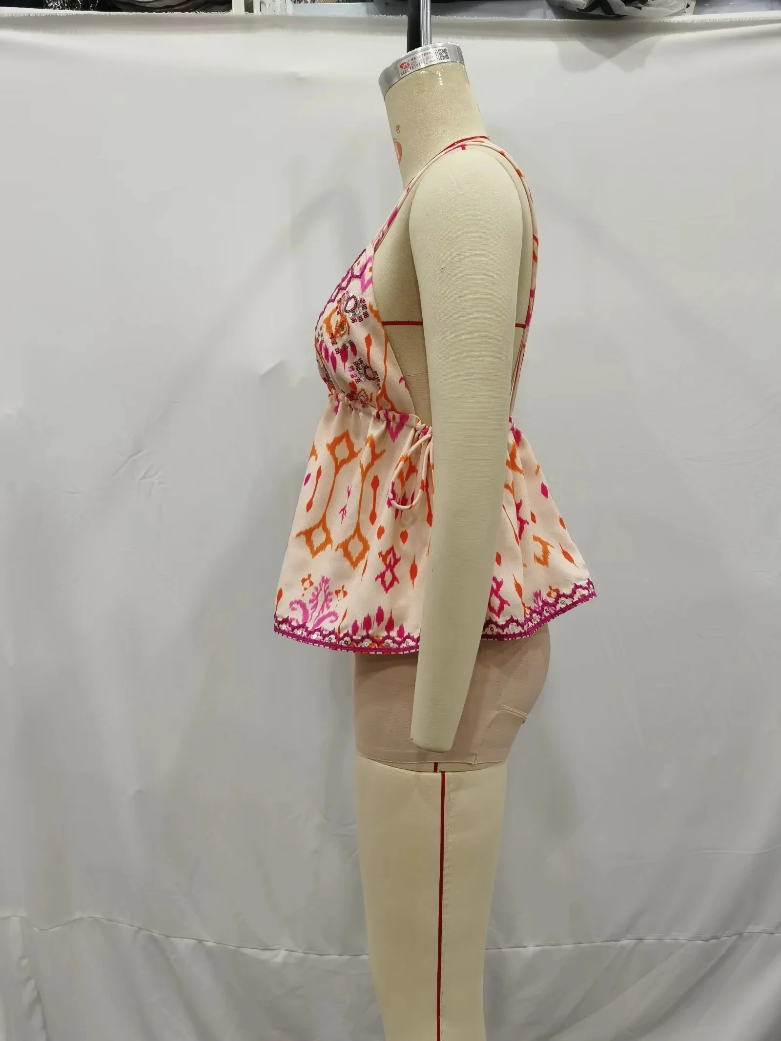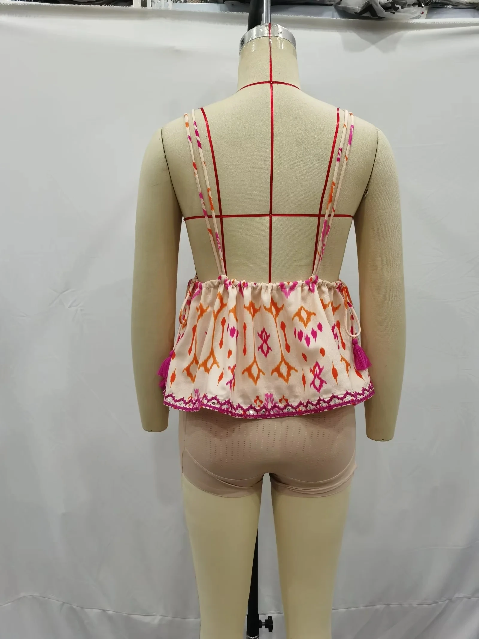 El top se conforma de dos triángulos que cubren el pecho formando un escote en forma de V, un listón que ajusta la cintura para pronunciarla y tela que cae de forma holgada en la parte baja de la prenda. No tiene espalda.
