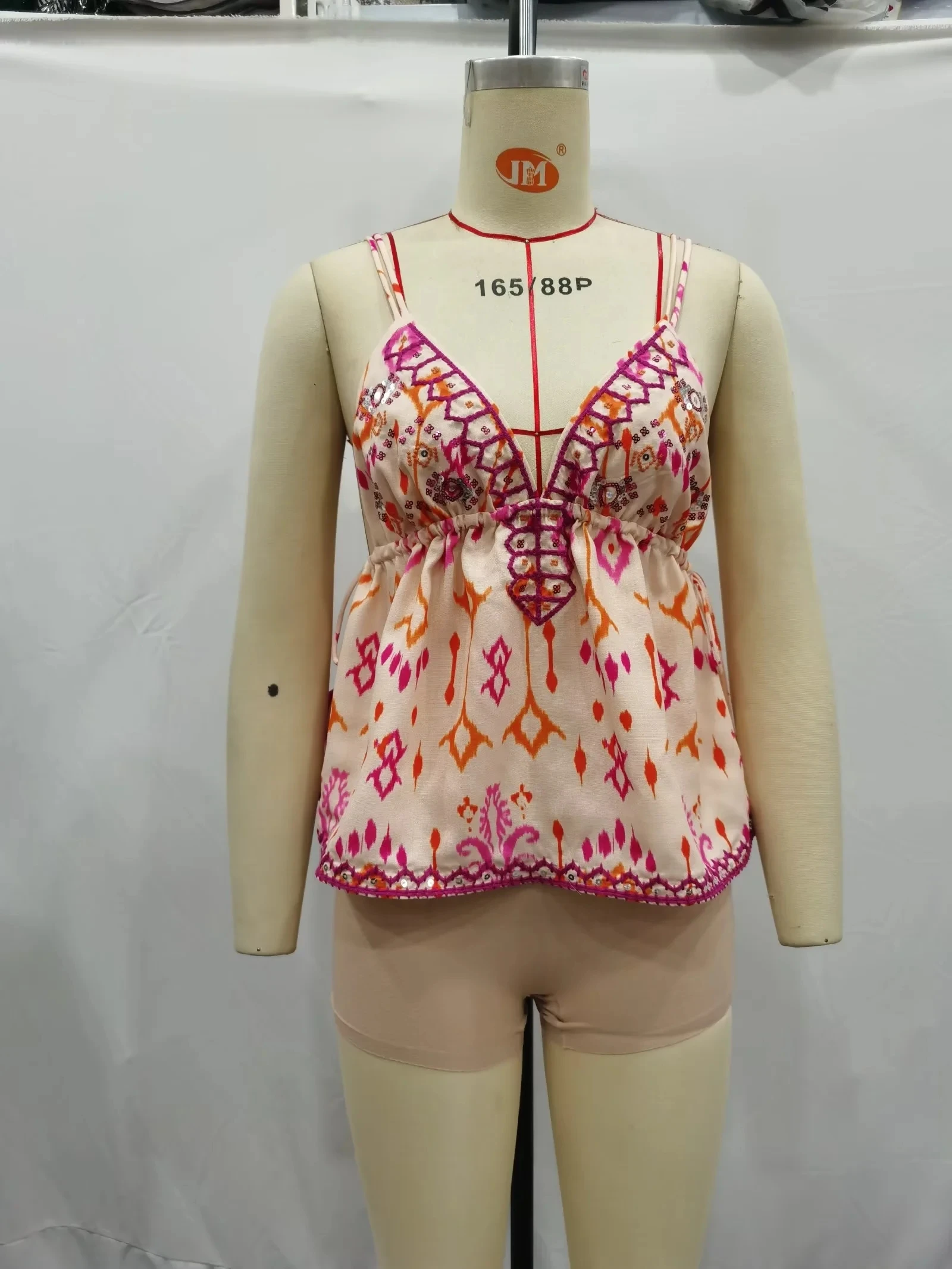 La blusa tiene distintos tonos rosados.