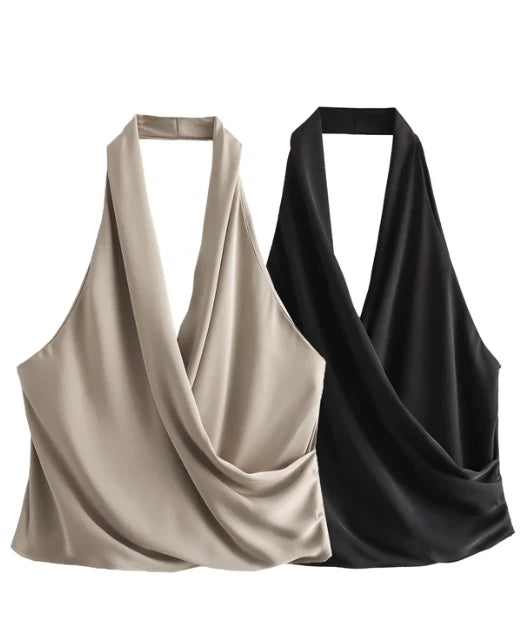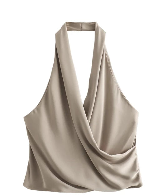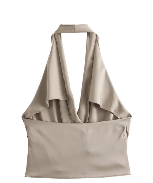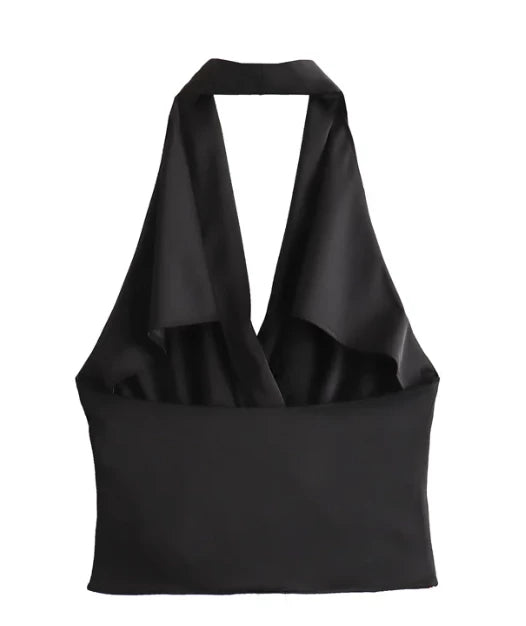 Top corto, halter y de satin. El top permite tener descubierta la mitad superior de la espalda. Tiene un dobles con caída natural en el escote.
