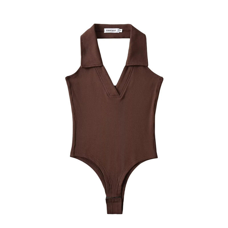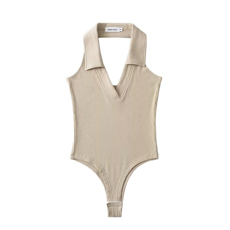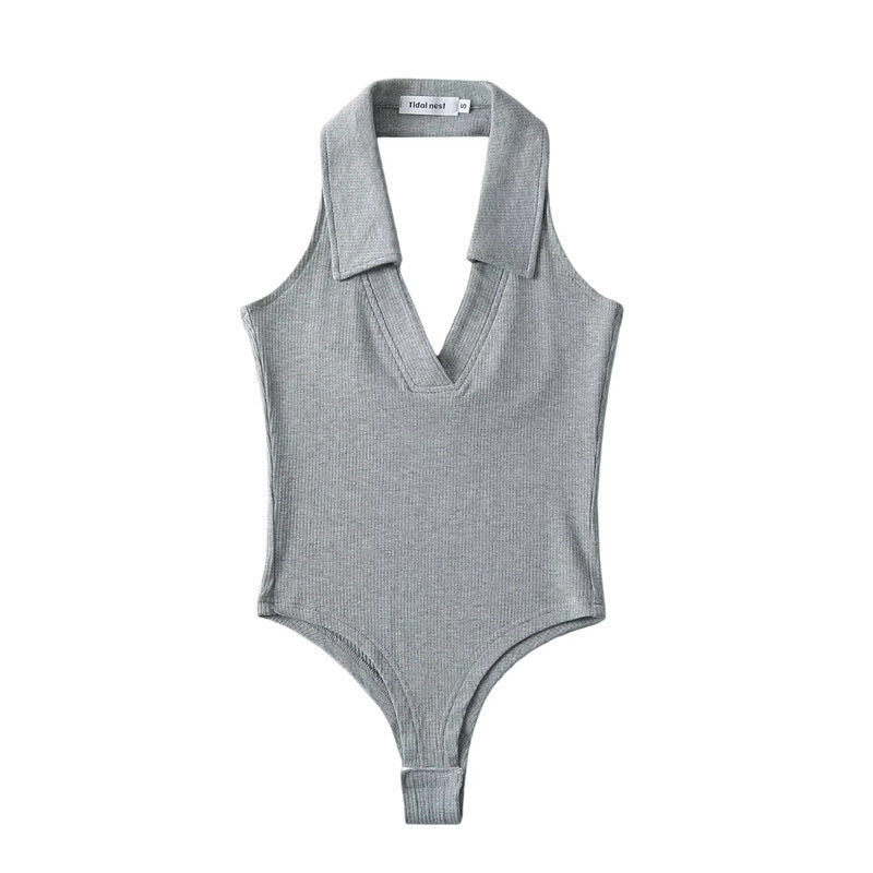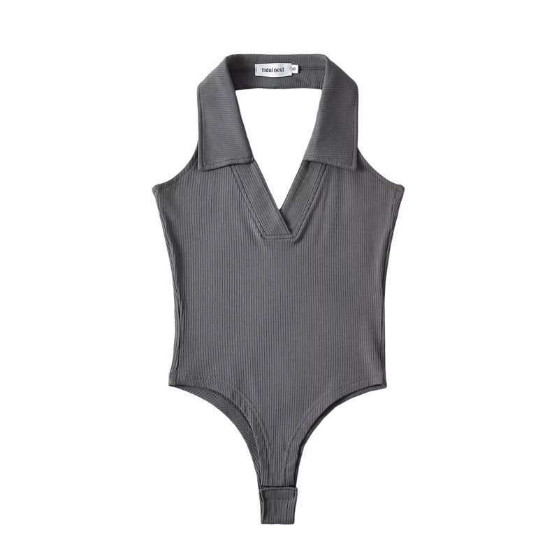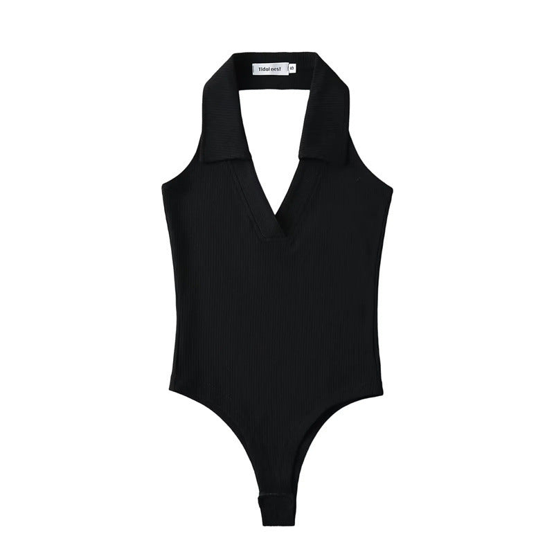 Un top estilo leotardo con cuello de polo. Este top no tiene mangas y tiene un escote en V. El cuello es halter lo que permite tener la espalda alta descubierta. Este se abrocha en la parte de abajo y la tela es stretch lo que permite que se ajuste al cuerpo.