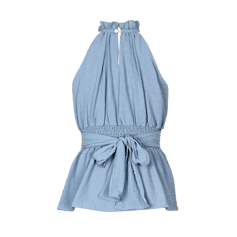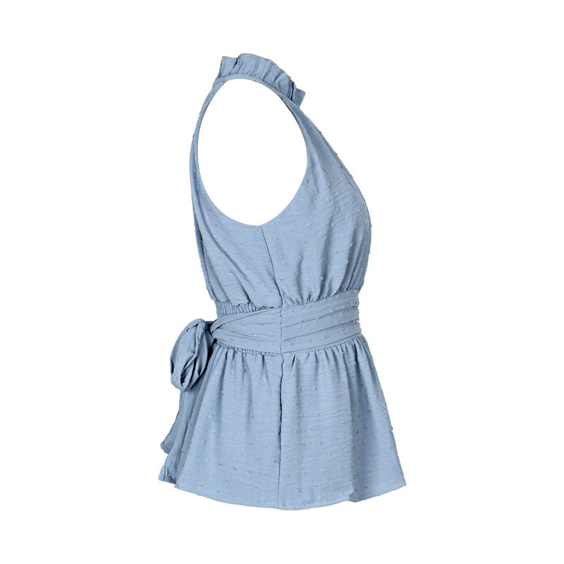 Una blusa linda y coqueta color azul claro, con detalles de textura, con la cintura pronunciada y unos listones para ajustarla más.