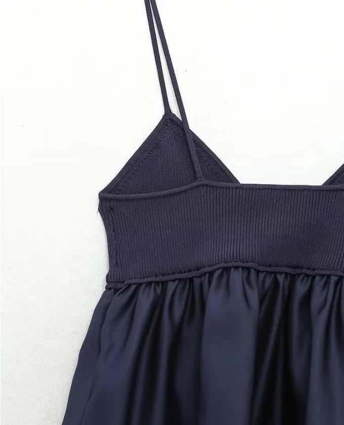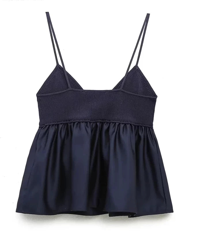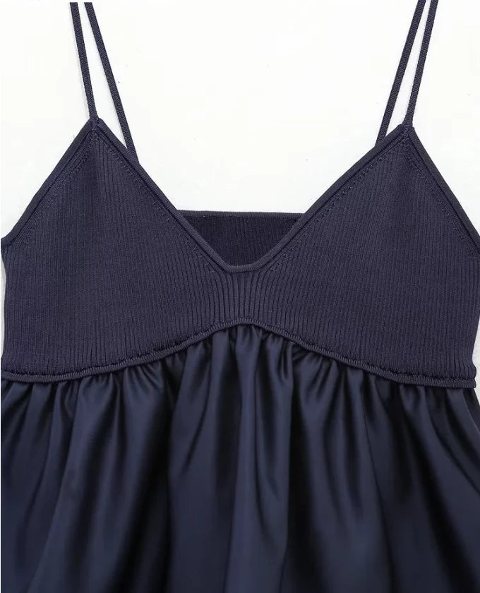 Top lindo y sexy de tirantes, con dos tipos de tela, algodón y satin, y escote V. En la parte de arriba esta la tela de algodón que estira un poco. La parte de abajo es de satin, y aunque se ve muy amplia de tela, cae muy bonito.