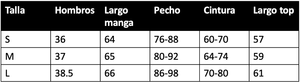 *Recomendamos revisar la tabla de medidas antes de realizar la compra. Si tienes dudas entre dos medidas, te recomendamos elegir la más grande.
