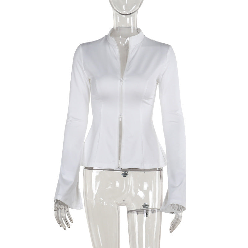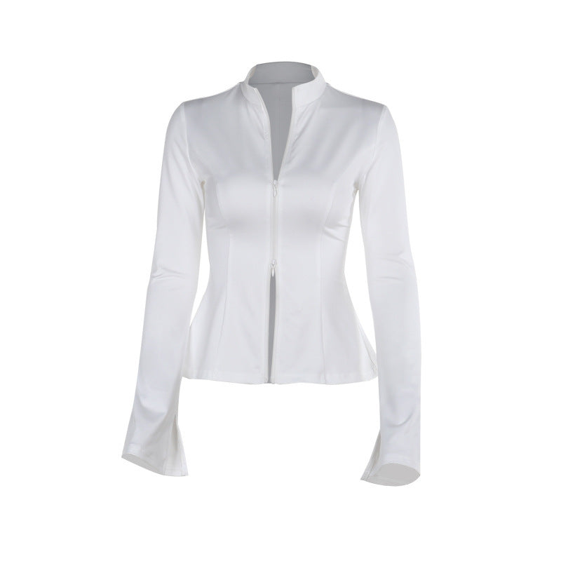 Top de manga larga con abertura en el frente que se abrocha del centro con un zipper. Va ajustada al cuerpo. No transparenta.