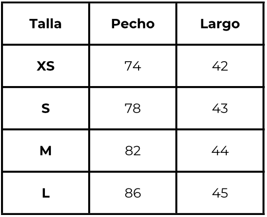 * Recomendamos revisar la tabla de medidas antes de realizar la compra. Si tienes dudas entre dos medidas, te recomendamos elegir la más grande.