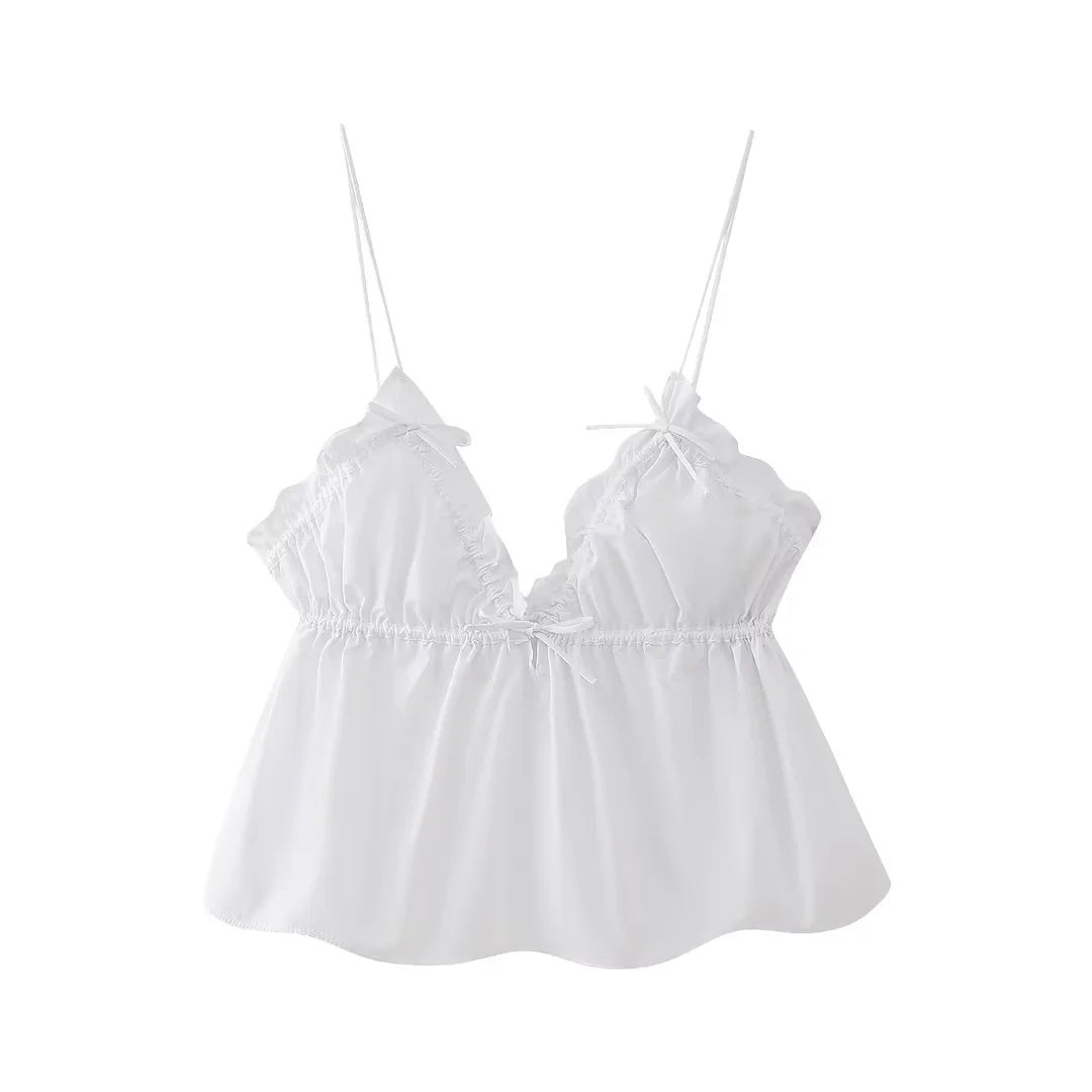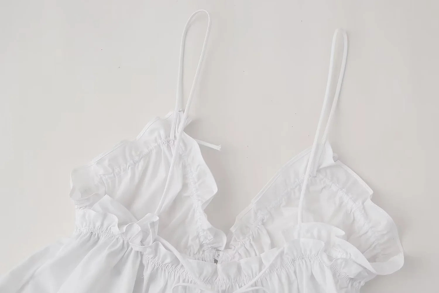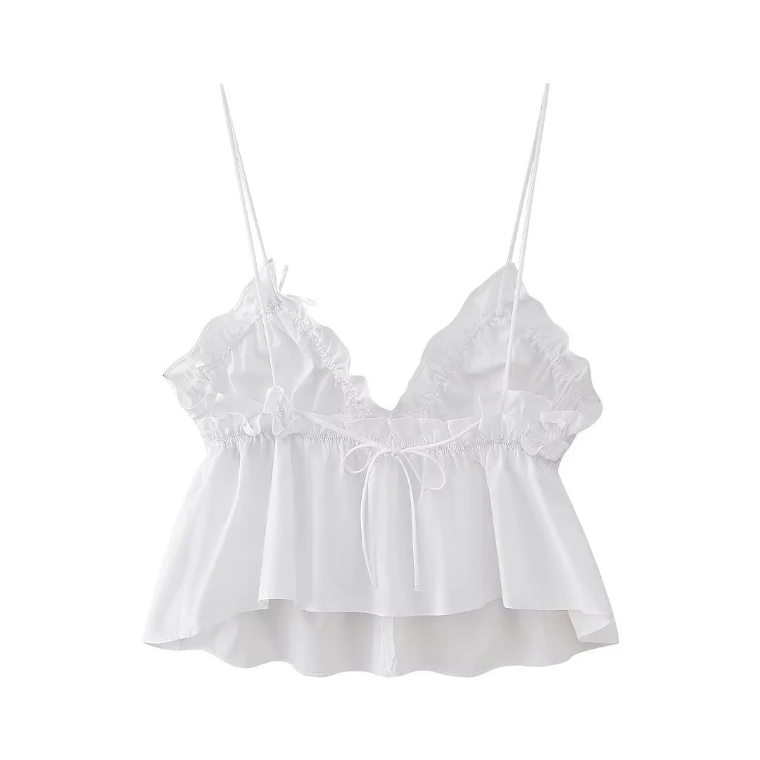 Un top muy lindo y coqueto de tirantes, con escote en forma de V y con un al finalizar el pecho de donde cae la tela en corte A. El top tiene unos olánes en la parte de arriba.