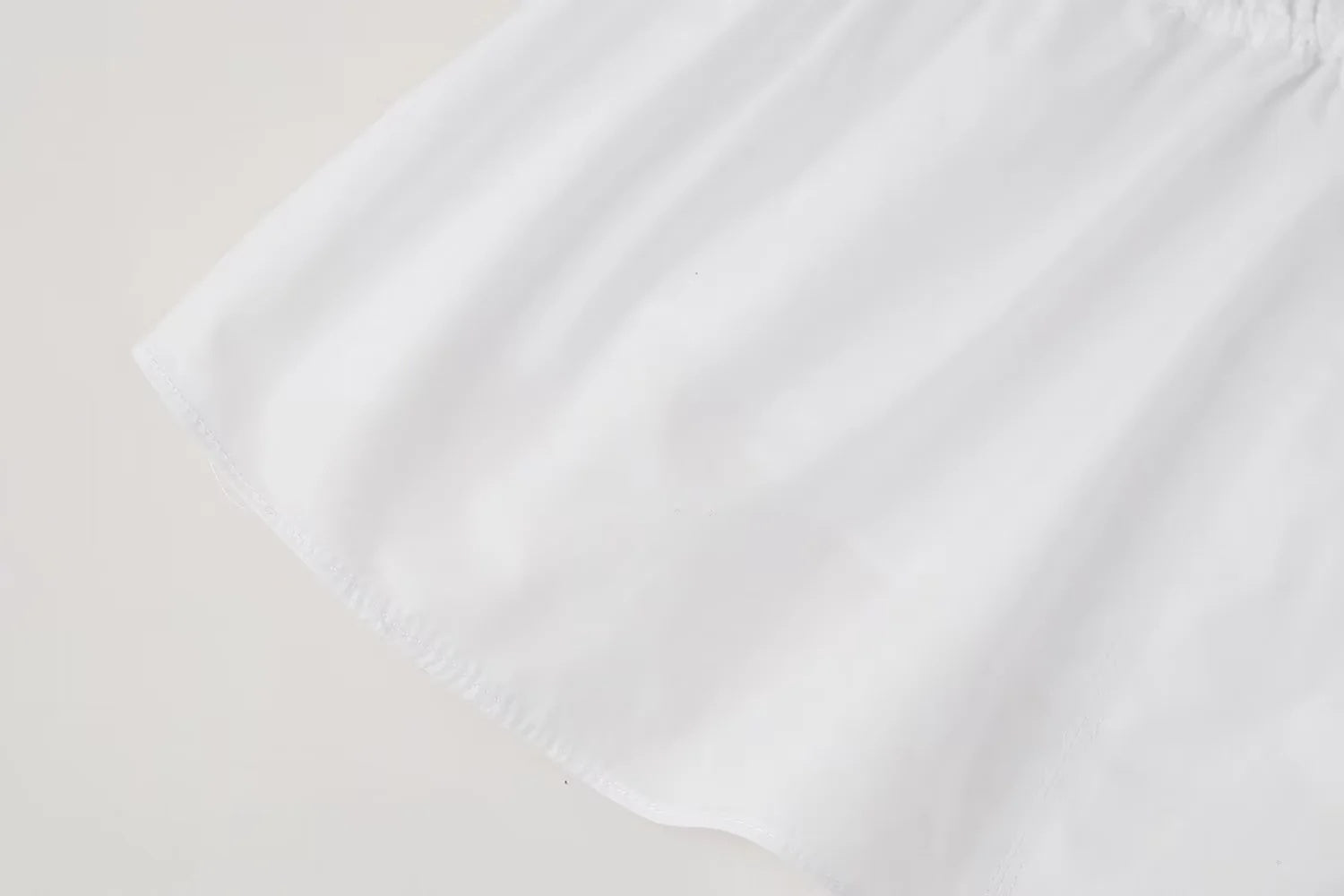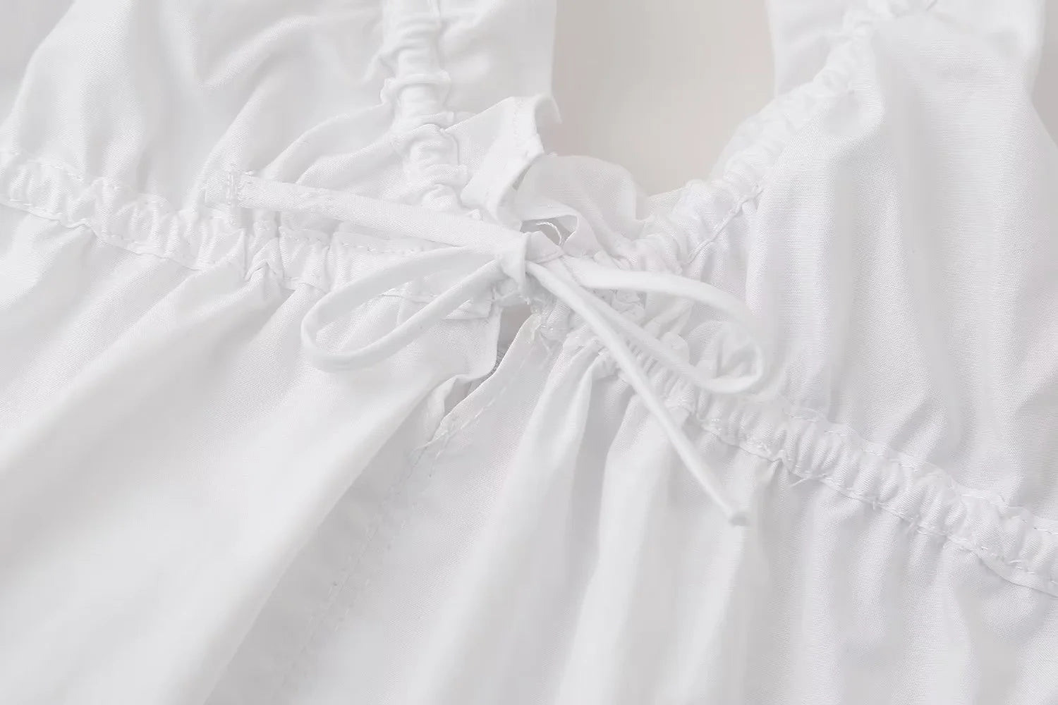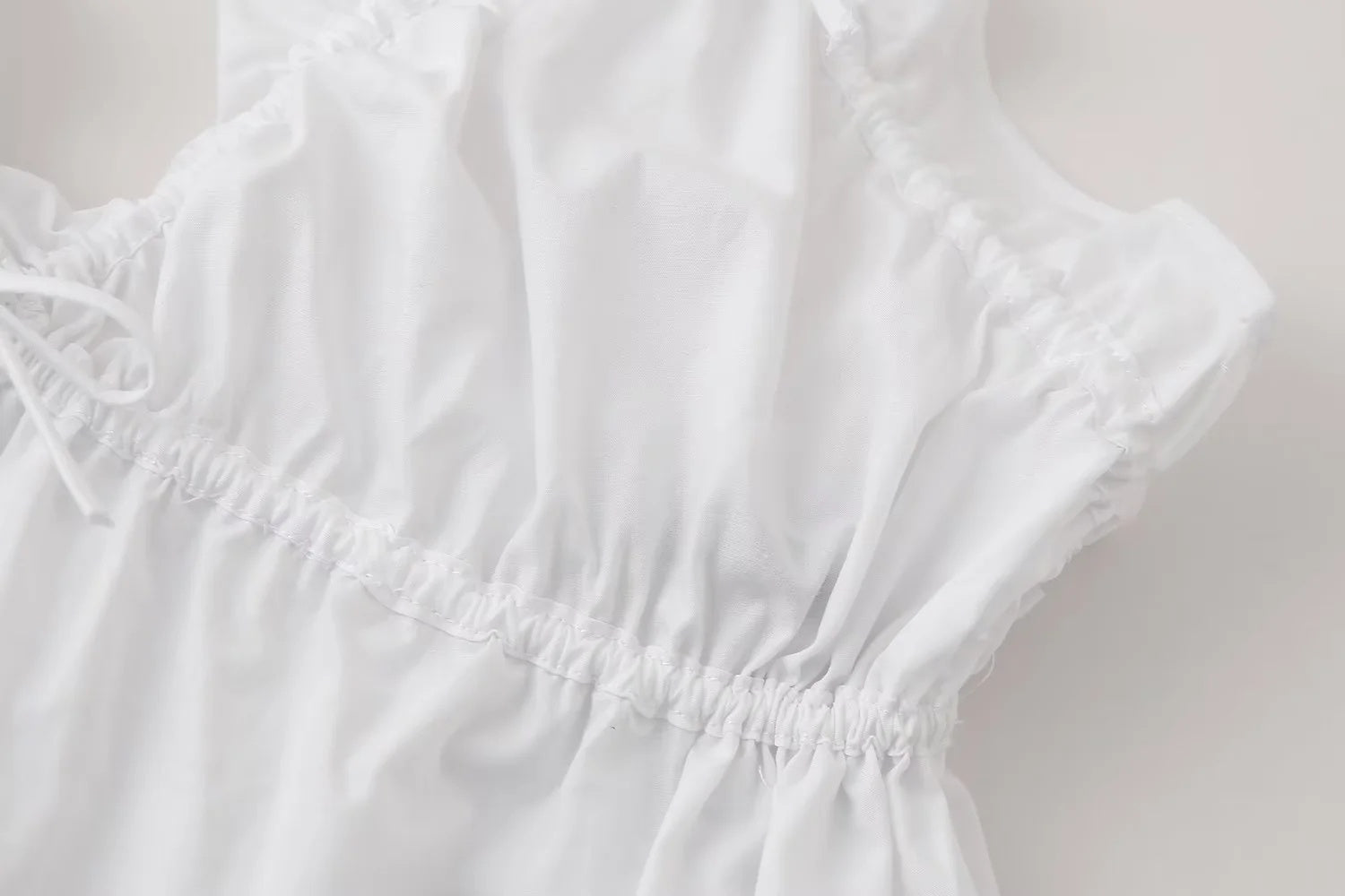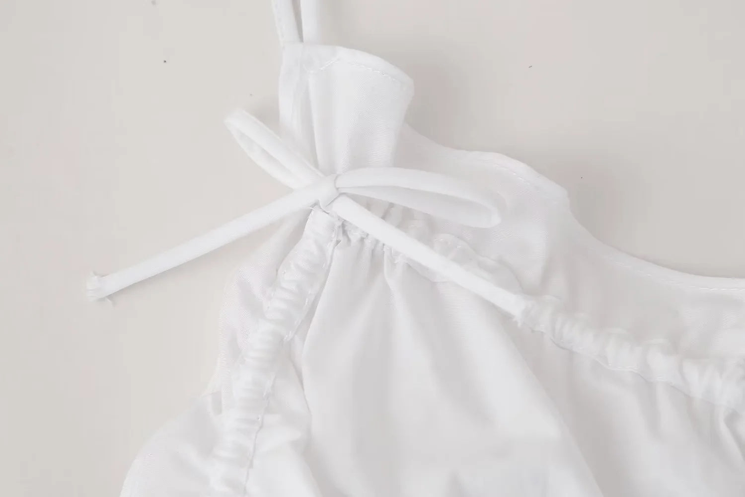 El top es blanco, ideal para combinarlo con unos jeans acampanados o unos shorts.