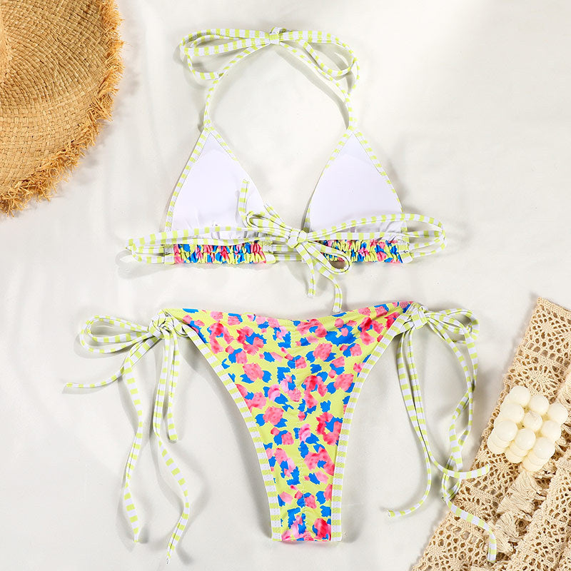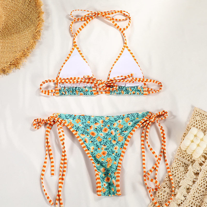 Bikini chico con un color predominante, print de flores de diferentes colores y un contorno de color que contrasta. Este bikini es una combinación de sexy y cute.