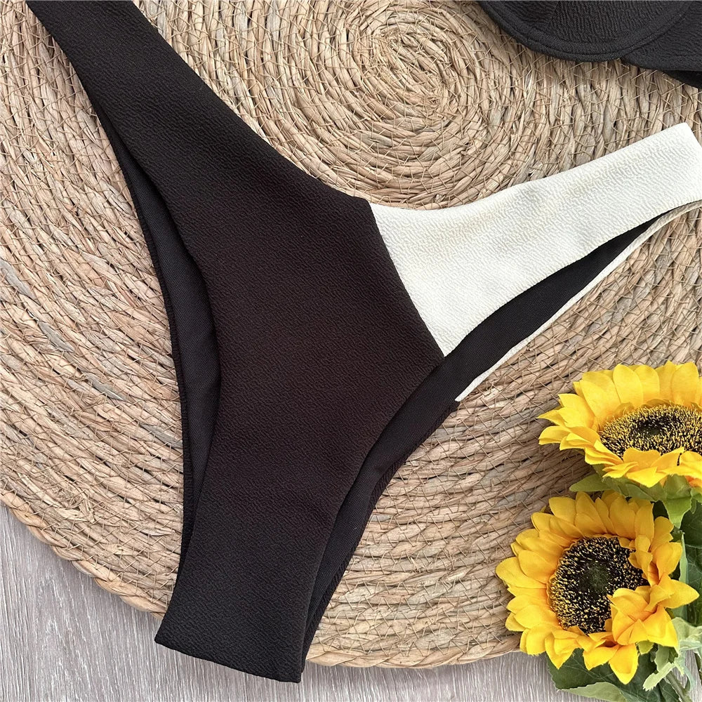 Bikini lindo y sexy que ayuda a lucir un cuerpo muy lindo. Ambos top y bikini son negros con detalle de color blanco, el top lo tiene arriba y el bikini lo tiene de un lado. El top es estilo bra con hebillas y un escote estilo V. La parte de abajo es tipo brazilian, que significa que es más pequeña que un bikini normal.