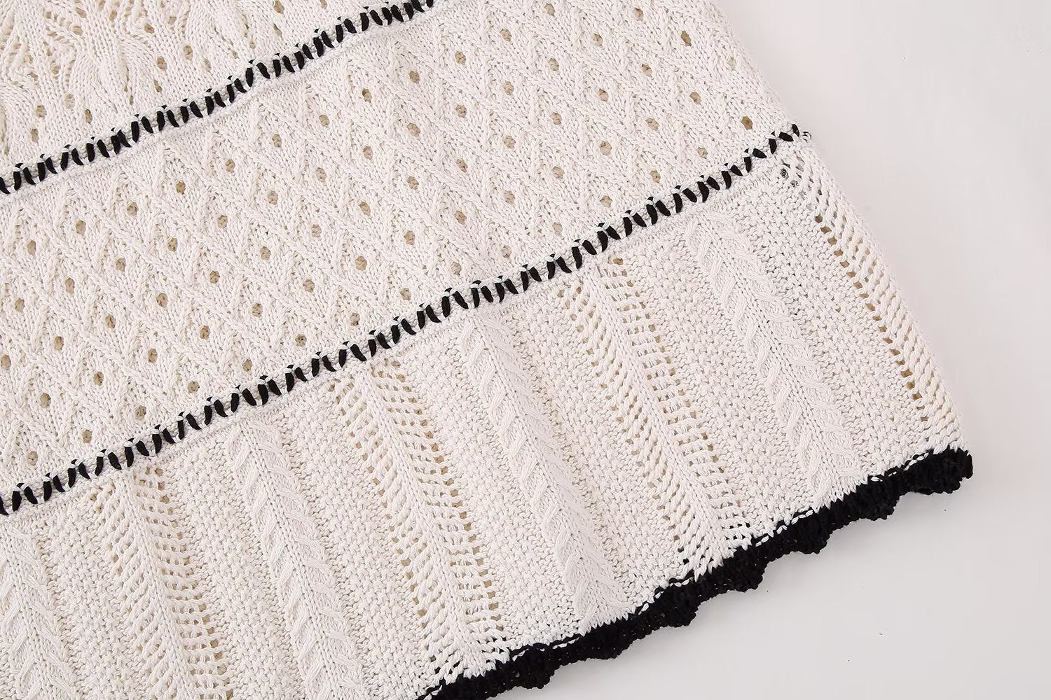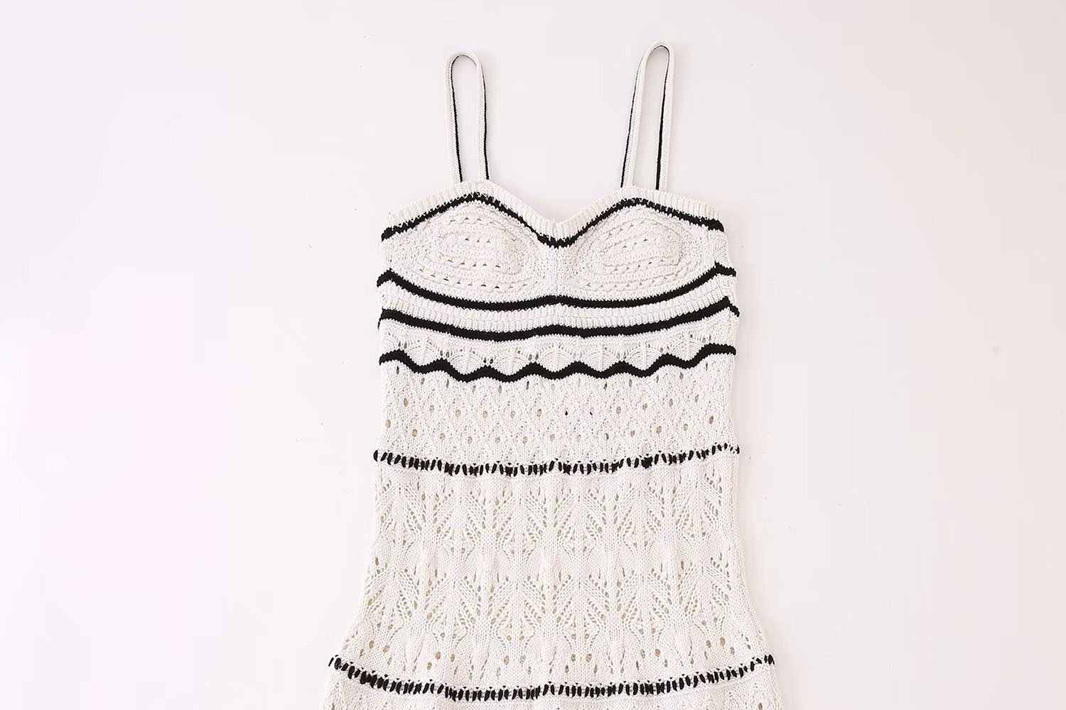 Un vestido de punto, pero ideal para el verano. El vestido es largo, de tirantes delgados, escote en V. A lo largo del vestido se cruzan unas líneas negras delgadas y horizontales. El bordado cambia cada separación por la línea negra. La falda tiene caída de tipo A.