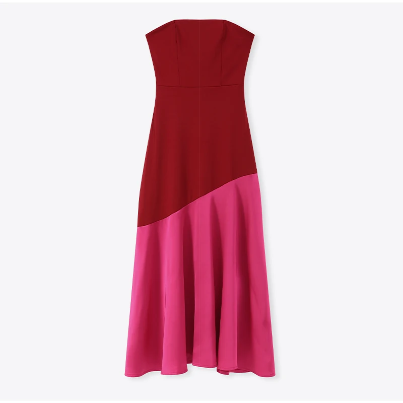 Es strapless, ajustado del pecho a la cintura y holgado a partir de ahí. Tiene una tela en la parte de arriba y en la parte de la falda sale diferente tela y color para darle un toco diferenciador.