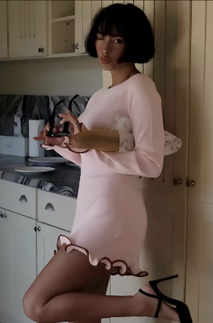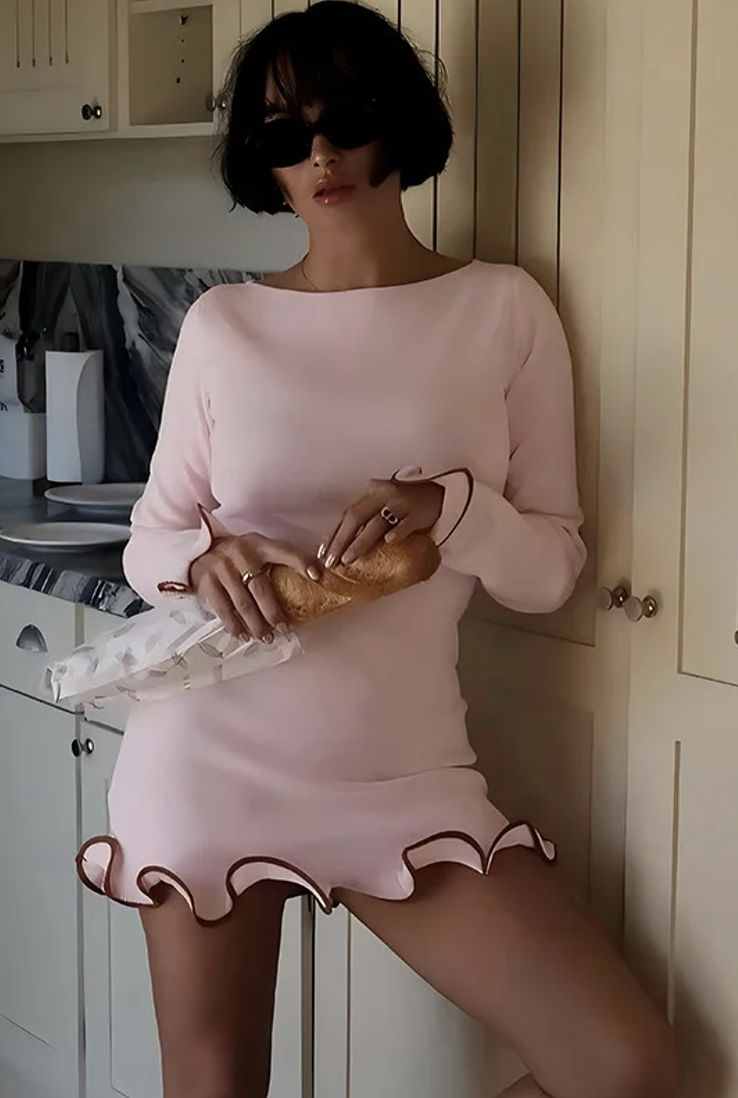 Un vestido de manga larga muy coqueto. Es tamaño mini, ajustado al cuerpo con una tela stretch. Al final de las mangas y del vestido hay un olán de la misma tela con una pequeña línea que delínea de otro color contrastante al color del vestido.