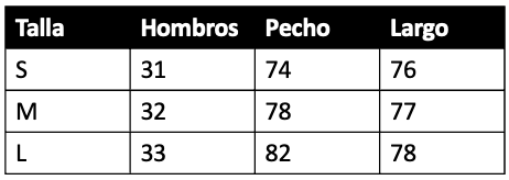 *Recomendamos revisar la tabla de medidas antes de realizar la compra. Si tienes dudas entre dos medidas, te recomendamos elegir la más grande.